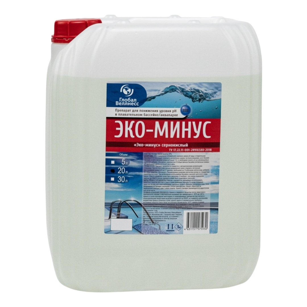 Global Wellness Экоминус - жидкое средство для снижения уровня pH воды, что способствует созданию комфортных условий для купания. Препарат применяется совместно с автоматическими дозирующими станциями. При их отсутствии (ручное дозирование) нужно следовать инструкции, расположенной на этикетке.
