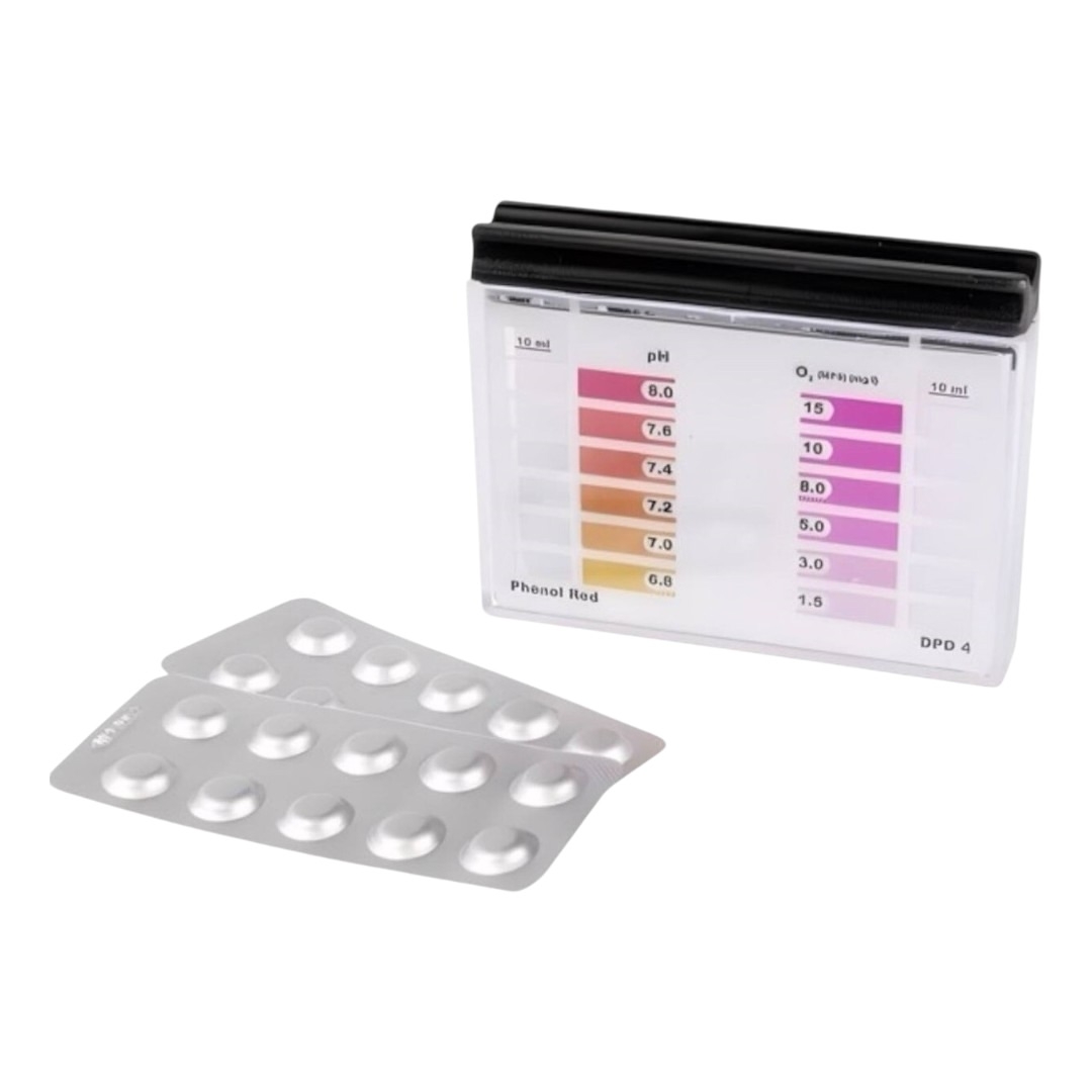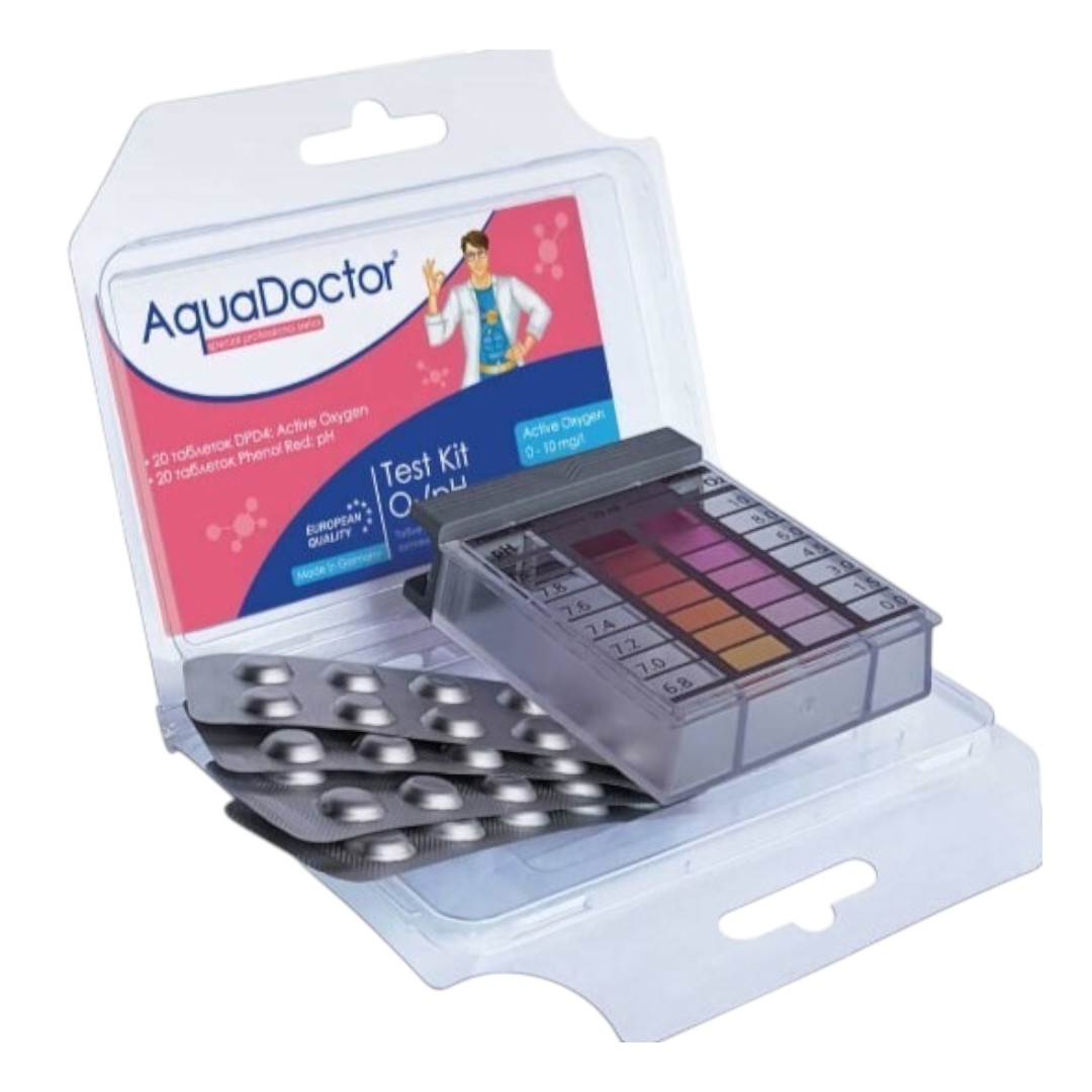 Таблеточный тестер AquaDoctor - предназначен для определения уровня pH и измерения содержания активного кислорода в воде. Для определения качества воды используются реагенты Phenol Red (pH) и DPD№4 (O2-кислород).