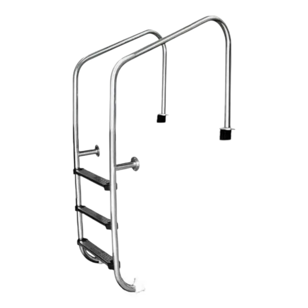 Монтируется в верхней части бассейна при помощи закладных стаканов со стальными накладками. Имеет дополнительное фланцевое крепление на уровне первой ступеньки. Нижняя часть лестницы упирается в стену бассейна резиновыми заглушками. Крепежные элементы поставляются в комплекте.
