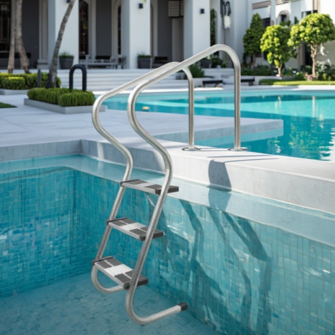 Лестница Pool King FM203 - используется для удобного и безопасного спуска в бассейн. Отлично подходит для переливных бассейнов с широким бортом. Наклонная конструкция лестницы обеспечивает облегченный подъем и спуск в бассейн. Изготовлена из нержавеющей стали, устойчивой к коррозии, воздействию ультрафиолета и химических реагентов. Ступени с антискользящими накладками.