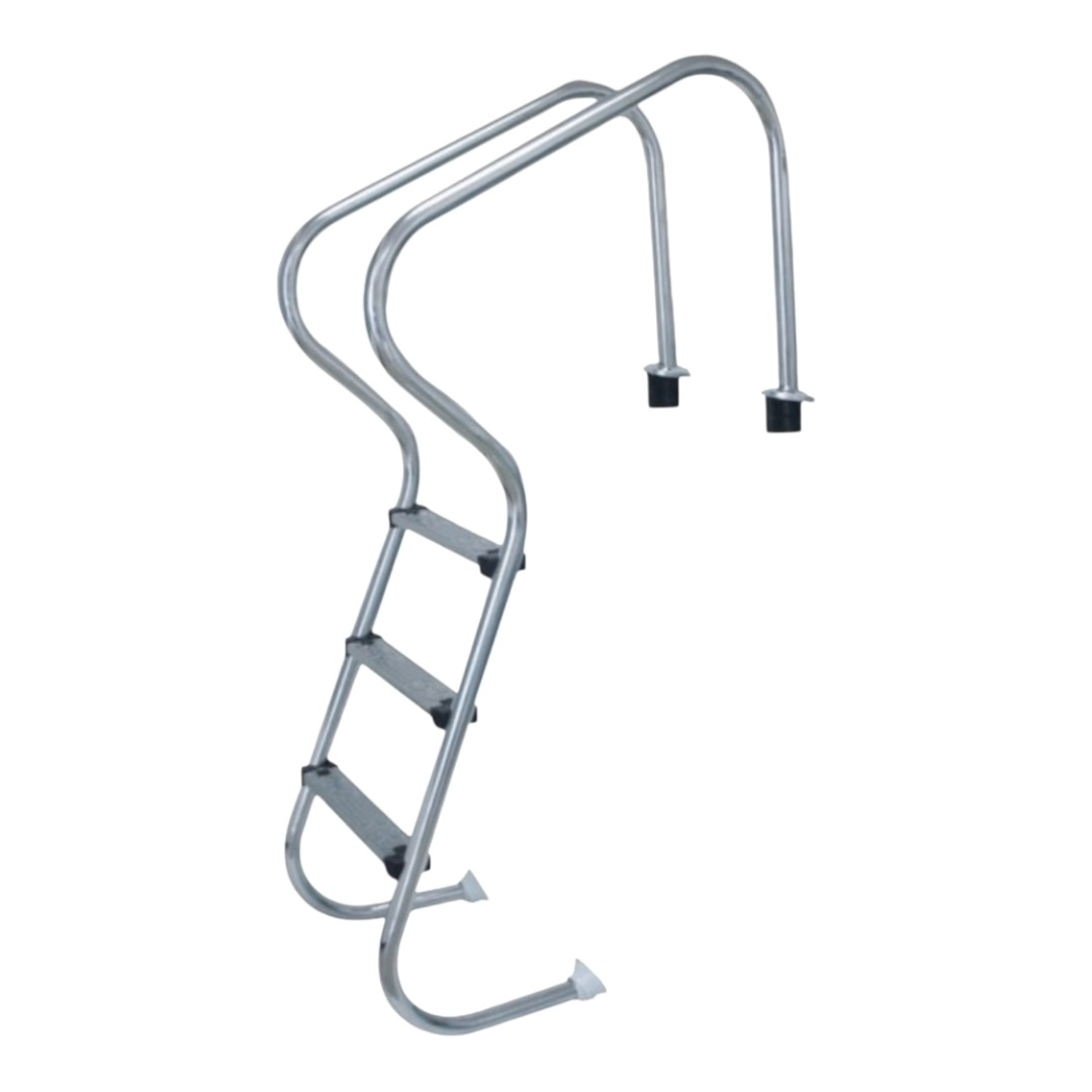 Монтаж лестницы выполняется с помощью закладных пластиковых стаканов, требующих бетонирования. Нижняя часть лестницы упирается в стену бассейна резиновыми заглушками. Закладные детали поставляются в комплекте.