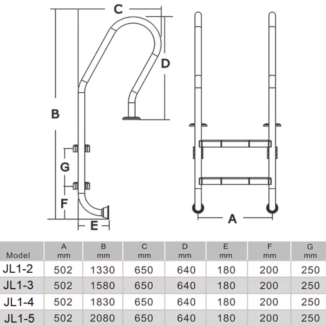 Лестница Jcaqua JL1-4S - используется для удобного и безопасного спуска в бассейн. Изготовлена из кислостойкой нержавеющей стали, устойчивой к коррозии, воздействию ультрафиолета и химических реагентов. Поручни крепятся к борту при помощи пластиковых стаканов (анкеров). Нижняя часть лестницы упирается в стену бассейна прорезиненной заглушкой. Ступени крепятся к поручням с помощью болтов.