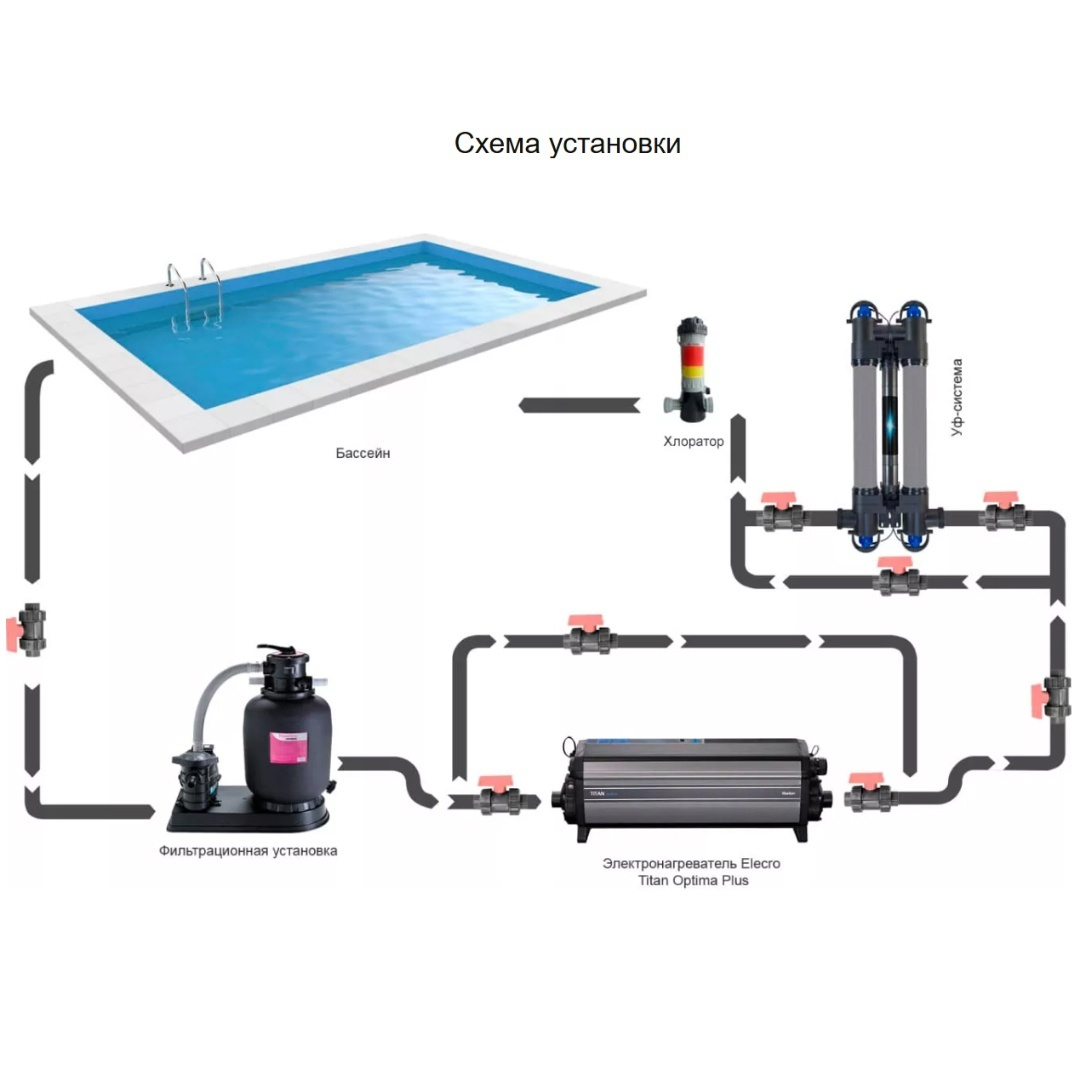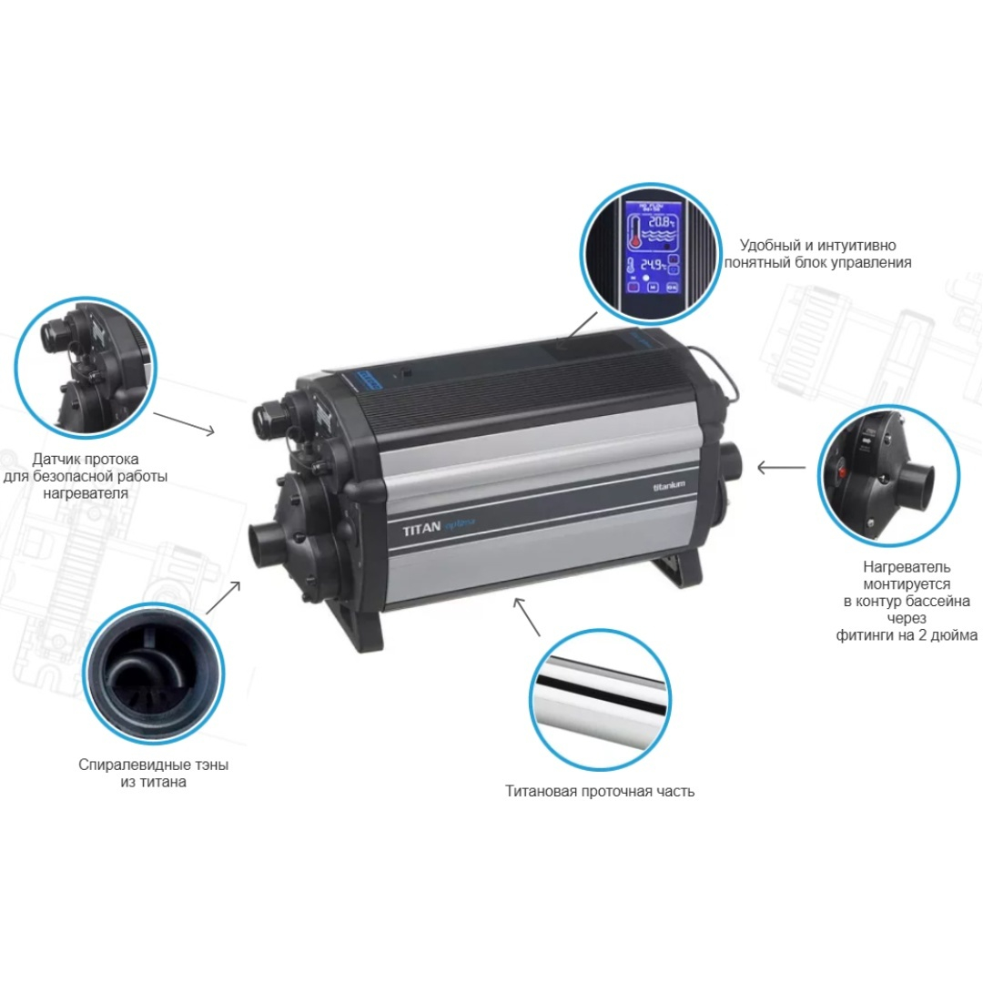 Нагревательный элемент и проточная часть выполнены из титанового сплава. Спиралевидными тэнами, создается воронкообразная траектория потока воды, что исключает возможность появления накипи. Защиту от перегрева и сухого хода обеспечивает датчик перегрева и переключатель потока. В нагревателе используются контакторы Siemens увеличенного размера, которые обеспечивают более надежнее соединение и гарантируют долговечность работы устройства. Встроенный термостат с сенсорным экраном, защитные терморегуляторы. Цифровые таймеры для каскадного включения.