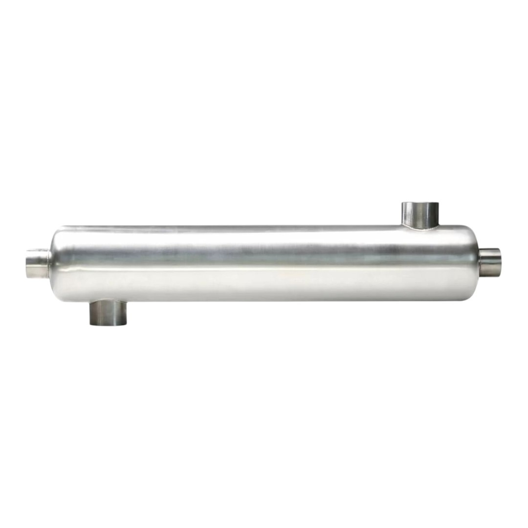 Корпус теплообменника и внутренние гофрированные трубки изготовлены из нержавеющей стали, устойчивой к коррозии, воздействию ультрафиолета и химических реагентов. Минимальные теплопотери достигаются за счет увеличенной площади внутренних гофрированных спиральных трубок. Такая конструкция снижает водное сопротивление, предотвращает утечки и продлевает срок службы. Высокая скорость потока уменьшает образование накипи.