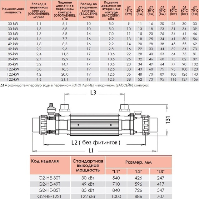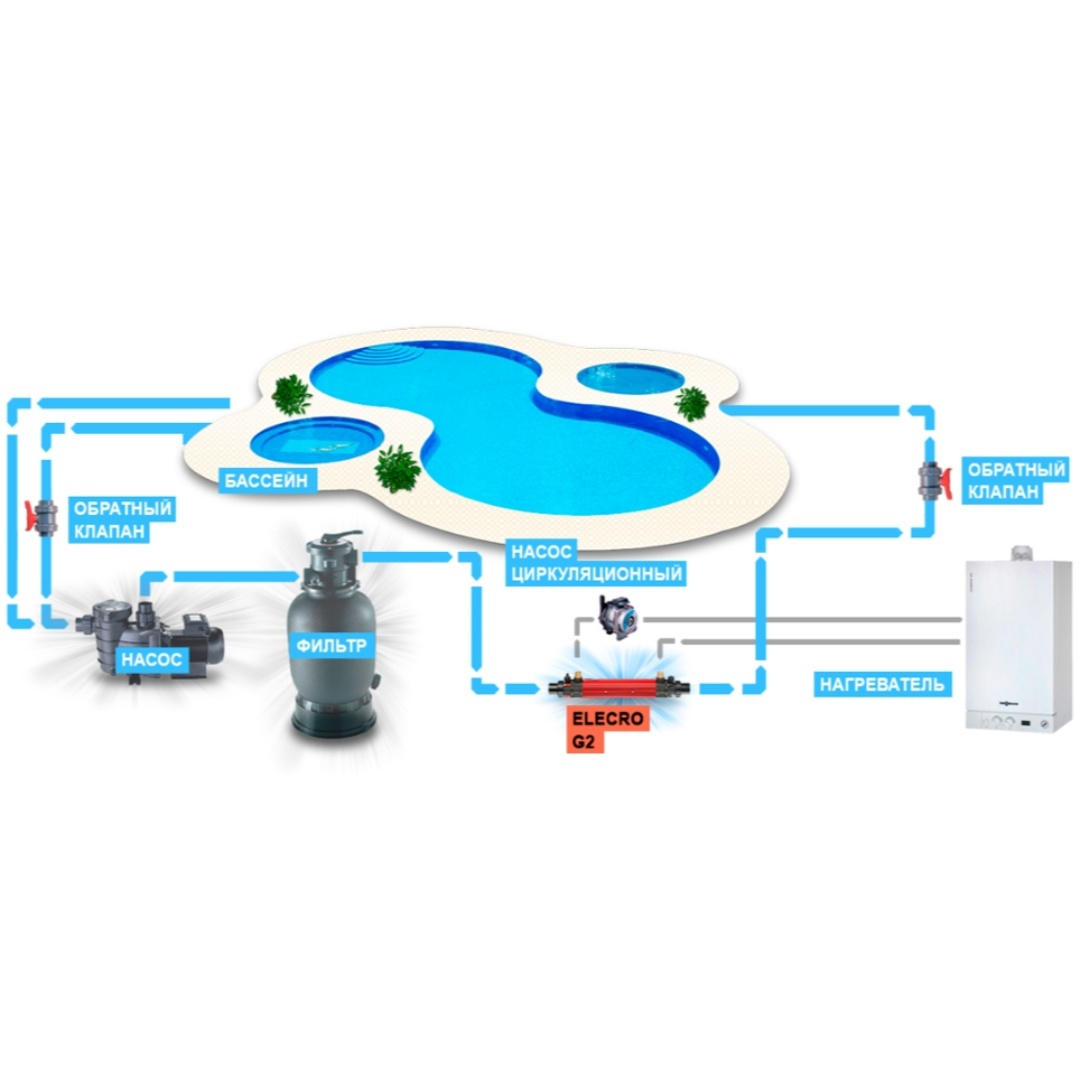 Корпус изготовлен из кислотостойкой нержавеющей стали. Трубки выполнены из сплава титана. Имеет высокую стойкость к коррозии, кислотам и повышенным температурам. Первичный контур подключается к источнику тепла и по нему направляется горячий теплоноситель, по вторичному контуру движется холодная вода, требующая нагрева. В результате теплообмена холодный поток нагревается до заданной температуры и направляется в бассейн.