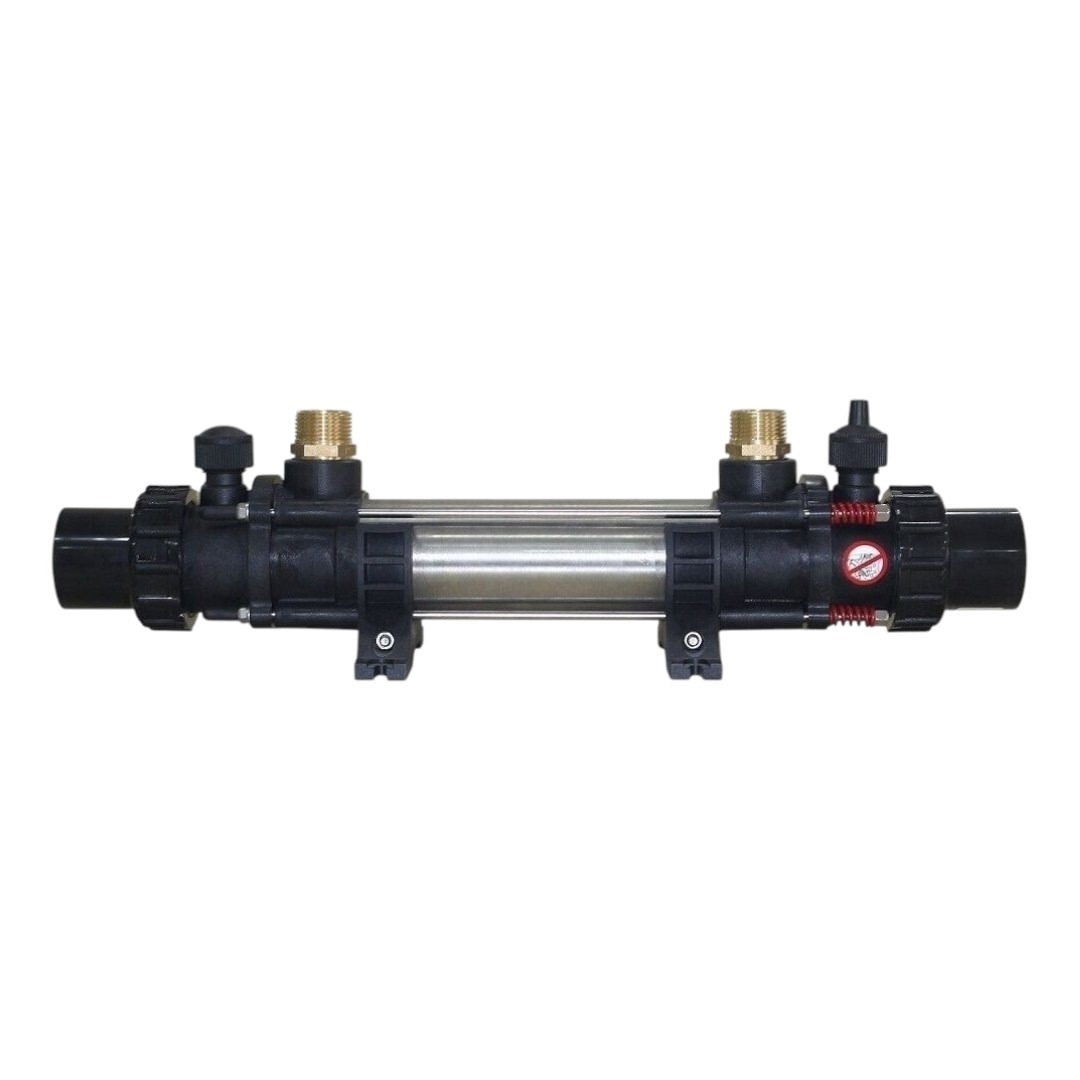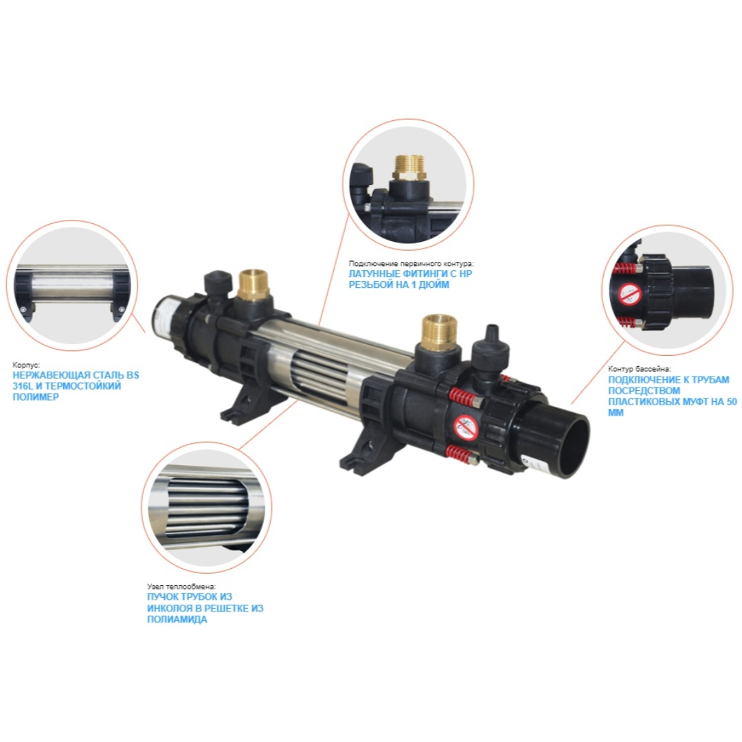 Корпус изготовлен из кислотостойкой нержавеющей стали. Трубки выполнены из сплава Incoloy (сплав из железа, никеля, молибдена, меди и хрома). Имеет высокую стойкость к коррозии, кислотам и повышенным температурам. Первичный контур подключается к источнику тепла и по нему направляется горячий теплоноситель, по вторичному контуру движется холодная вода, требующая нагрева. В результате теплообмена холодный поток нагревается до заданной температуры и направляется в бассейн.