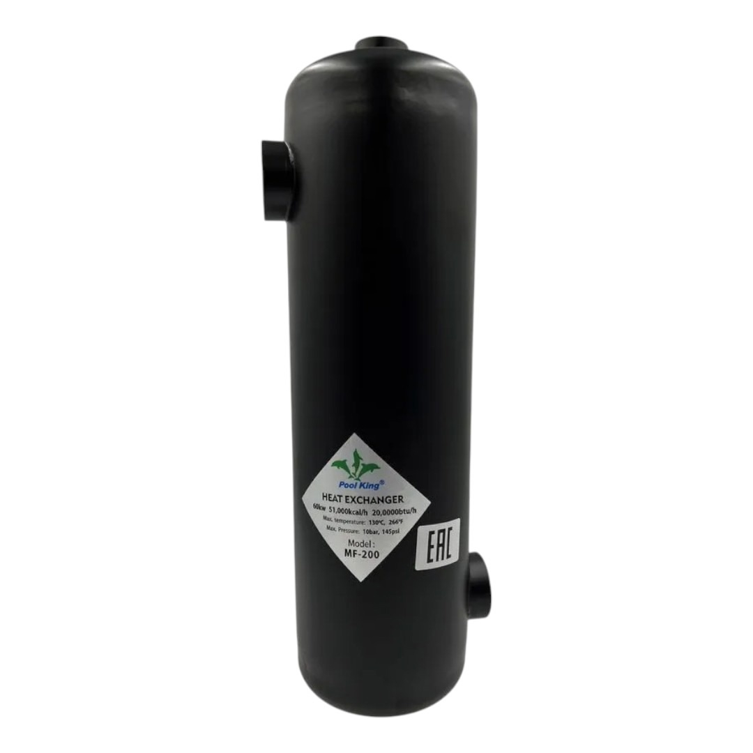 Теплообменник Pool King MF-200 - предназначен для поддержания заданной температуры воды в небольших частных и коммерческих бассейнах и СПА. Может быть подключен к электрическому водонагревателю, бойлеру, тепловому насосу или солнечным панелям.