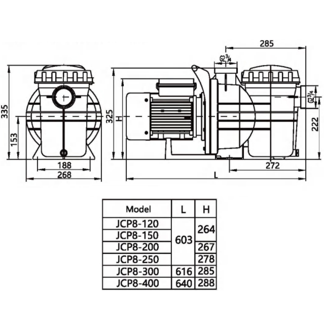 Насос Jcaqua JCP8-300 - предназначен для фильтрации и циркуляции воды в бассейне. Оснащен предварительным фильтром с прозрачной крышкой. Префильтр защищает систему от попадания крупного мусора. Прозрачная крышка префильтра позволяет легко контролировать уровень загрязнения.