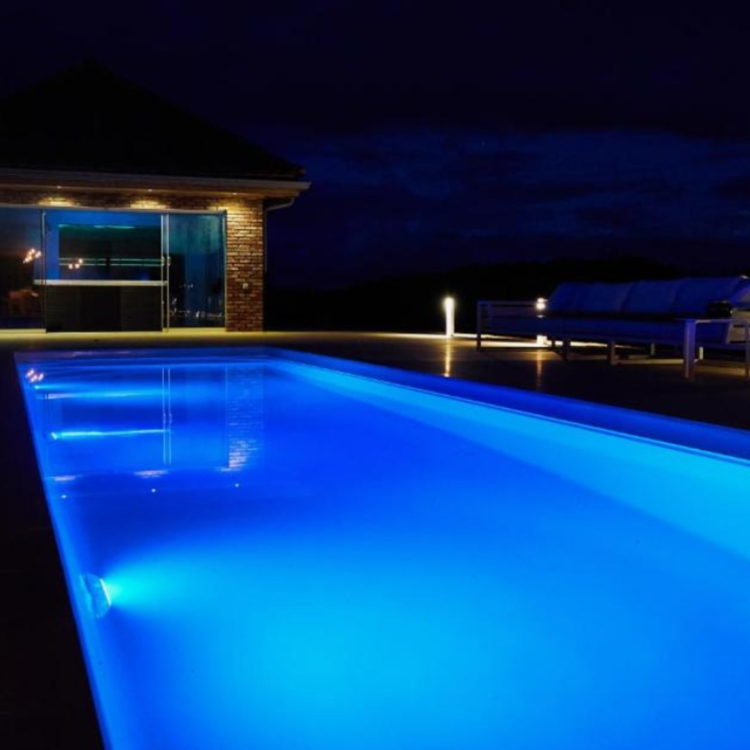 Корпус прожектора изготовлен из нержавеющей стали, устойчивой к коррозии, воздействию ультрафиолета и химии. Лицевая панель имеет зеркальную полировку. Поставляется в комплекте с закладной нишей.