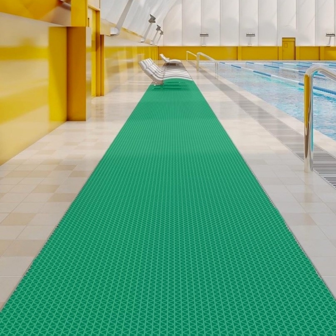 Покрытие изготовлено из прочного ПВХ, стойкого к ультрафиолету. Имеет текстурированную поверхность с ячеистой структурой. Легко чистится и легко укладывается в любом месте. Используется в качестве напольного покрытия для бассейнов, аквапарков, саун, душевых, раздевалок. Подходит для ванны, балкона, веранды, сада, обустройства ступеней, пандусов, детских площадок.