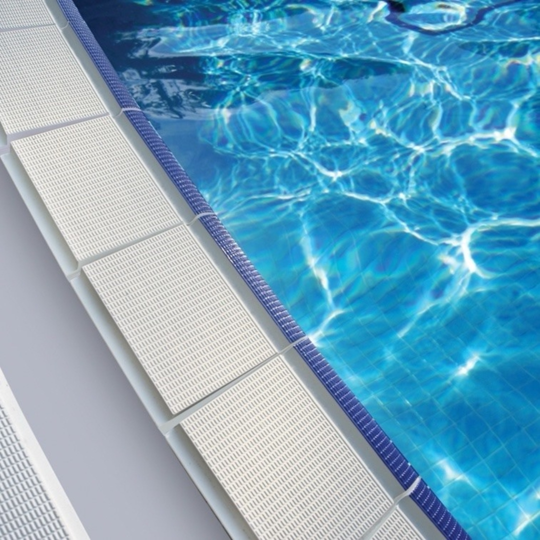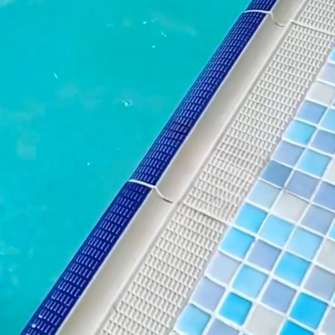 Плитка керамическая бордюрная Aquaviva - используется для облицовки переднего края борта бассейна. Удобный поручень дает возможность браться руками за бортик бассейна для отдыха или выполнения различных водных упражнений. Имеет противоскользящие насечки по всей длине. Надежная кладка за счет широких ребер на тыльной стороне плитки