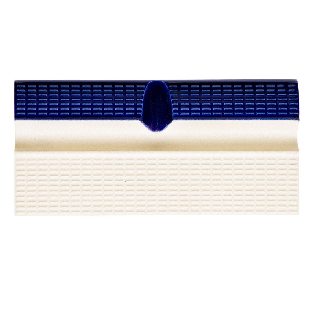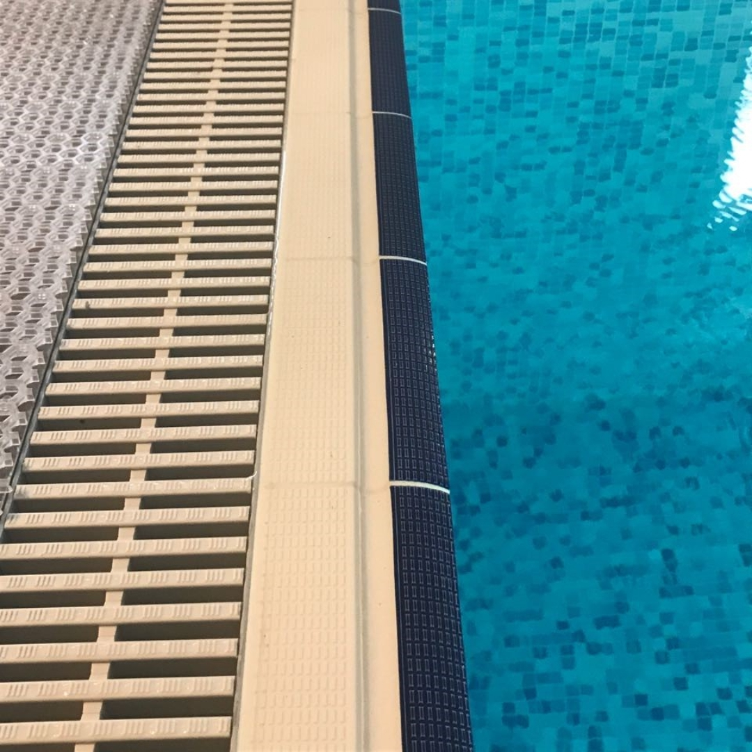 Плитка керамическая бордюрная Aquaviva - с поручнем и водостоком. Используется для облицовки переднего края борта бассейна. Удобный поручень дает возможность браться руками за бортик бассейна для отдыха или выполнения различных водных упражнений. Водосток обеспечивает возврат скопившейся на плитке воды обратно в чашу бассейна. Имеет противоскользящие насечки по всей длине. Надежная кладка за счет широких ребер на тыльной стороне плитки