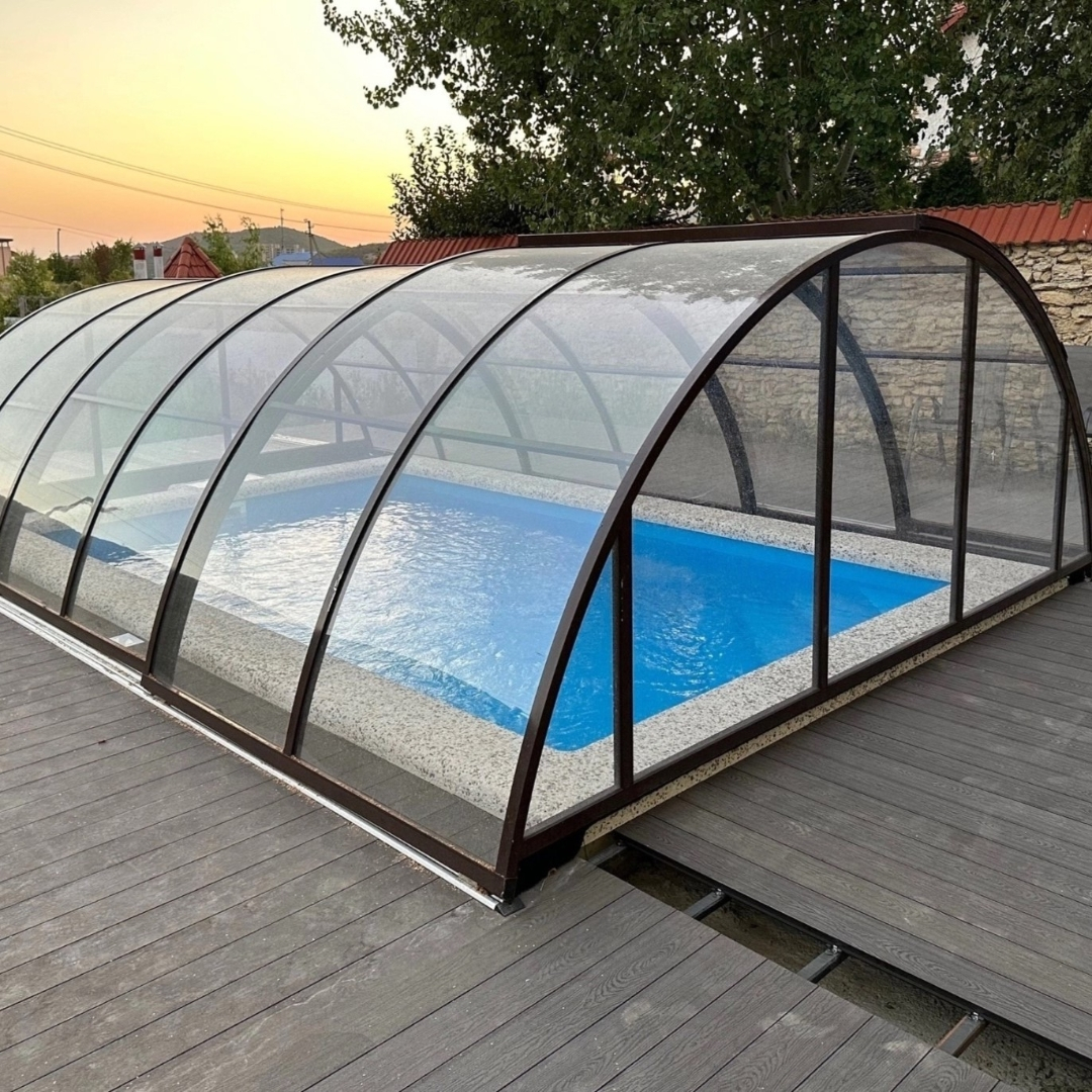 Раздвижной павильон Seccon STANDART H - позволяет продлить купальный сезон, защитить бассейн от загрязнений и непогоды, а также обеспечить безопасность. Каркас павильона изготовлен из алюминиевых профилей, которые хорошо держат форму и не деформируется. Раздвижная конструкция позволяет легко перемещать сегменты. Панели выполнены из прочного канального поликарбоната.