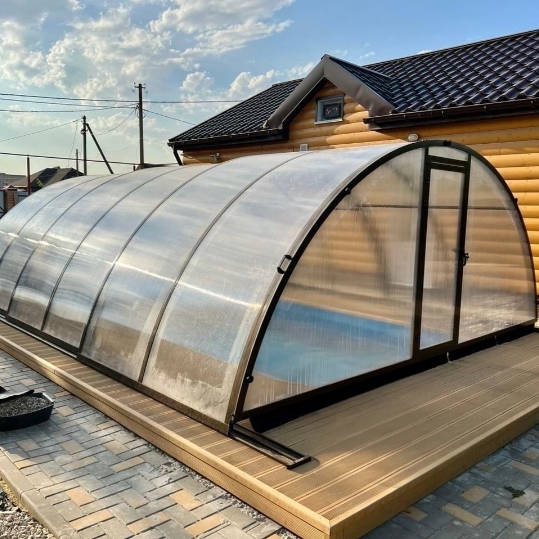 Раздвижной павильон Seccon STANDART H - позволяет продлить купальный сезон, защитить бассейн от загрязнений и непогоды, а также обеспечить безопасность. Каркас павильона изготовлен из алюминиевых профилей, которые хорошо держат форму и не деформируется. Раздвижная конструкция позволяет легко перемещать сегменты. Панели выполнены из прочного канального поликарбоната.