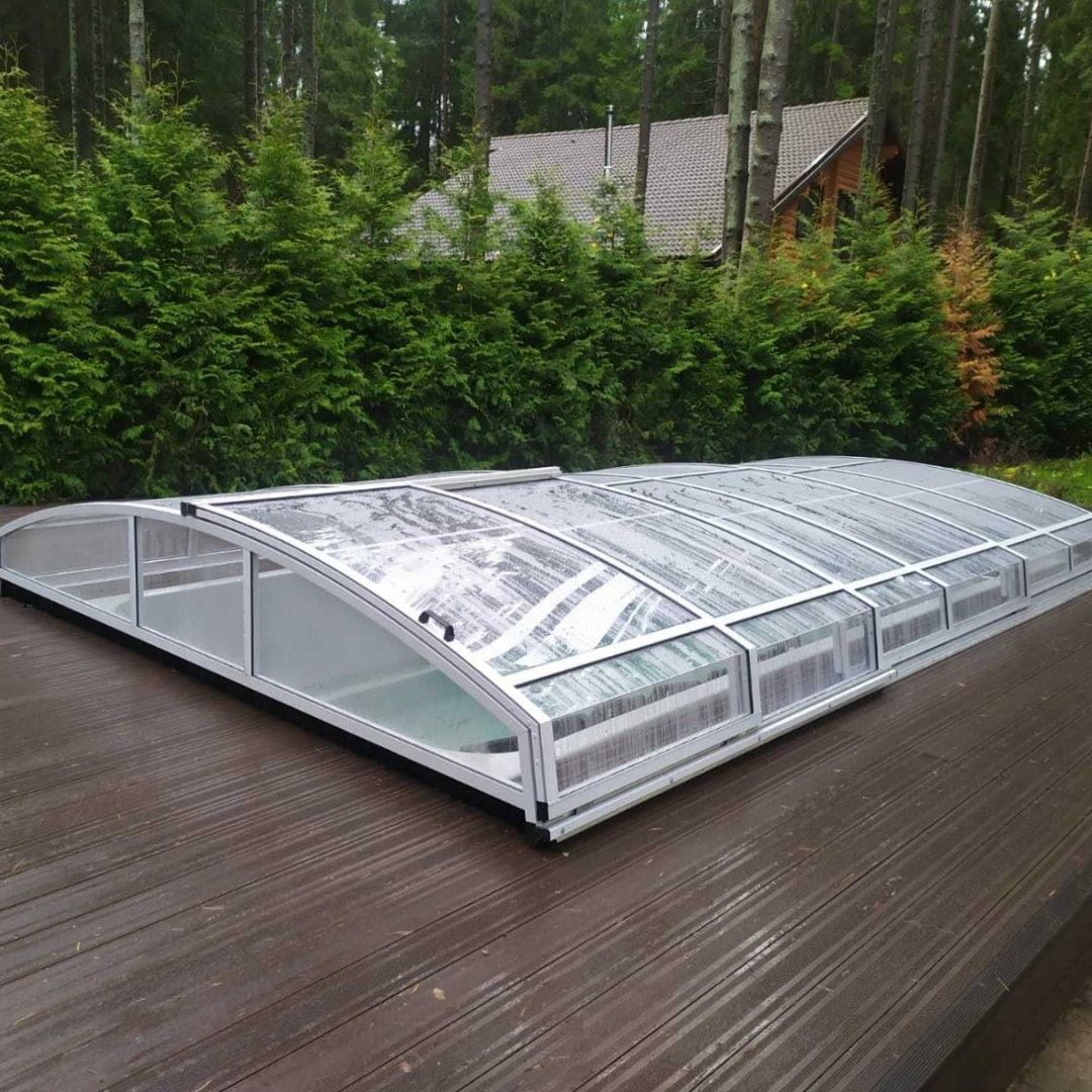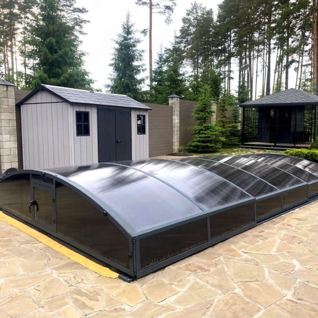 Раздвижной павильон Seccon AVRORA L - позволяет продлить купальный сезон, защитить бассейн от загрязнений и непогоды, а также обеспечить безопасность. Каркас павильона изготовлен из алюминиевых профилей, которые хорошо держат форму и не деформируется. Раздвижная конструкция позволяет легко перемещать сегменты. Панели выполнены из прочного канального поликарбоната.
