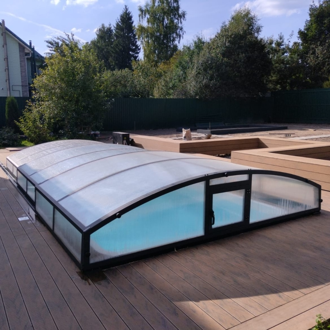 Раздвижной павильон Seccon AVRORA L - позволяет продлить купальный сезон, защитить бассейн от загрязнений и непогоды, а также обеспечить безопасность. Каркас павильона изготовлен из алюминиевых профилей, которые хорошо держат форму и не деформируется. Раздвижная конструкция позволяет легко перемещать сегменты. Панели выполнены из прочного канального поликарбоната.