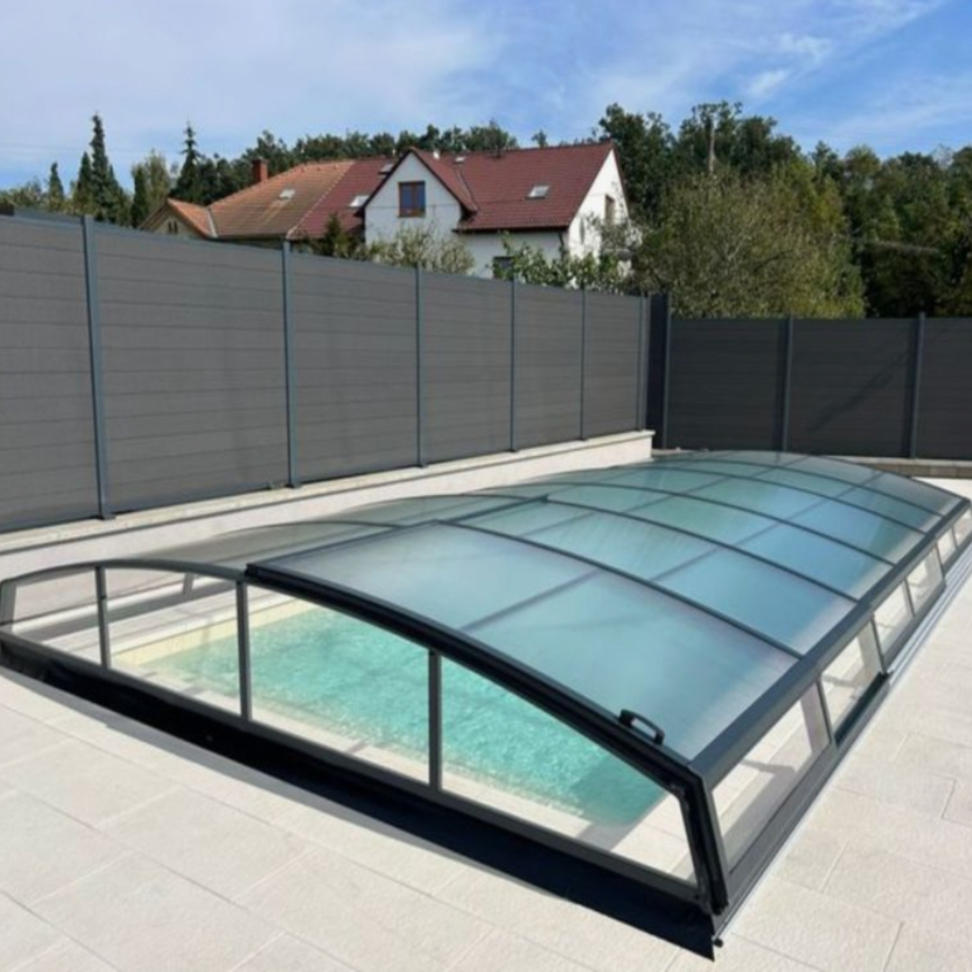 Раздвижной павильон Seccon AVRORA L - позволяет продлить купальный сезон, защитить бассейн от загрязнений и непогоды, а также обеспечить безопасность. Каркас павильона изготовлен из алюминиевых профилей, которые хорошо держат форму и не деформируется. Раздвижная конструкция позволяет легко перемещать сегменты. Панели выполнены из прочного канального поликарбоната.