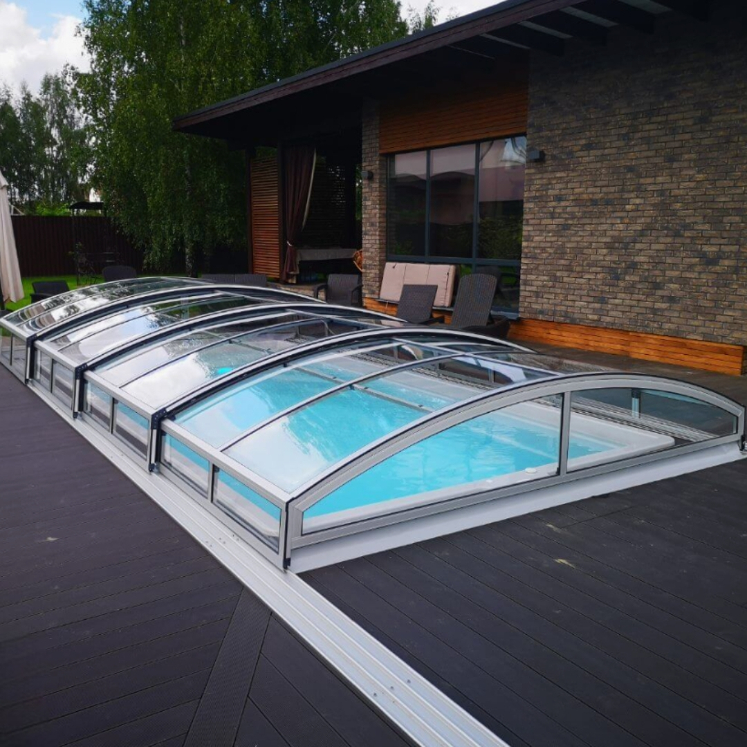 Раздвижной павильон Seccon AVRORA L - позволяет продлить купальный сезон, защитить бассейн от загрязнений и непогоды, а также обеспечить безопасность. Каркас павильона изготовлен из алюминиевых профилей, которые хорошо держат форму и не деформируется. Раздвижная конструкция позволяет легко перемещать сегменты. Панели выполнены из прочного канального поликарбоната.