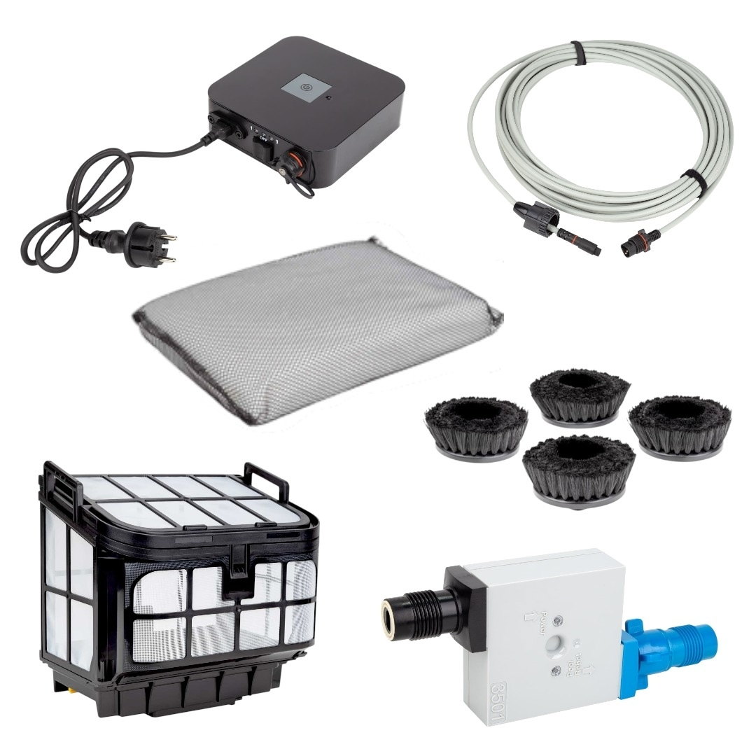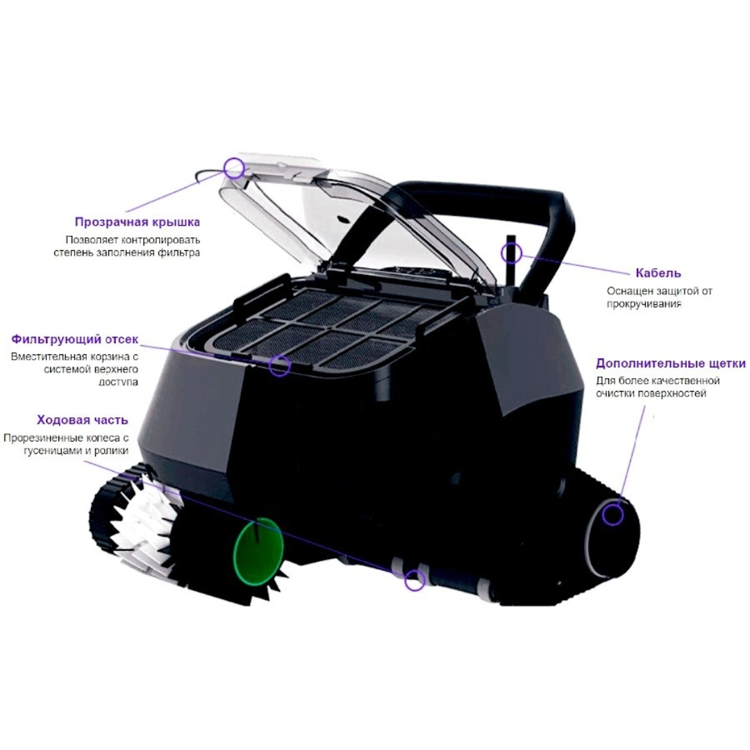 Очищающие валики оснащены комбинацией щеток из ПВХ и пенопластовых колец. Устройство имеет большую съемную фильтрующую корзину с системой верхнего доступа. Комплектуется удлиненным кабелем и дополнительными вращающимися щетками для очистки углов.