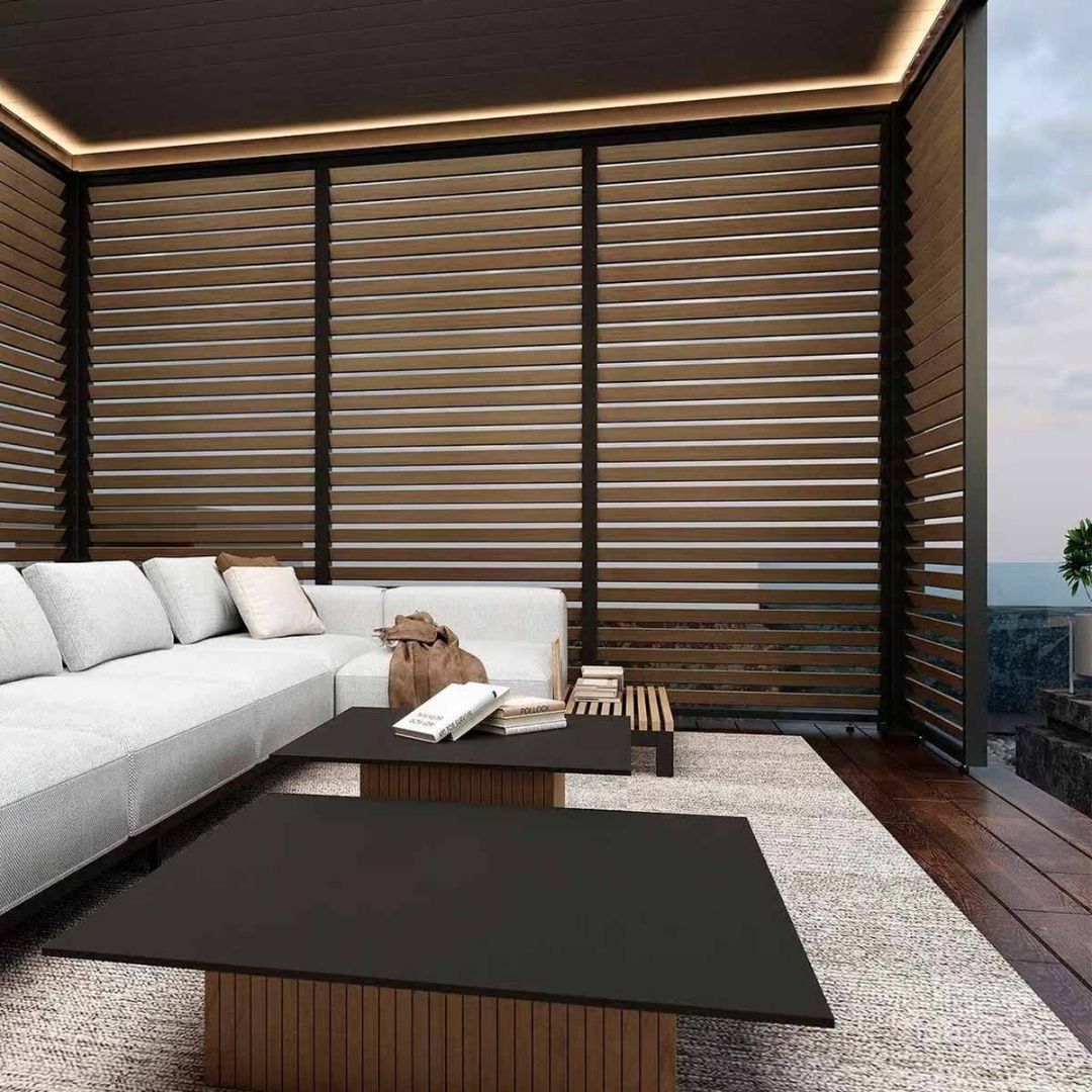 Вращающаяся горизонтальная боковая панель - является неотъемлемым дополнением к вашей перголе. Защищает от нежелательного солнца и ветера, обеспечивая при этом приток воздуха. Максимальная гибкость и удобство в соответствии с разнообразными потребностями и меняющимися погодными условиями. Изготовлена из прочного алюминия.