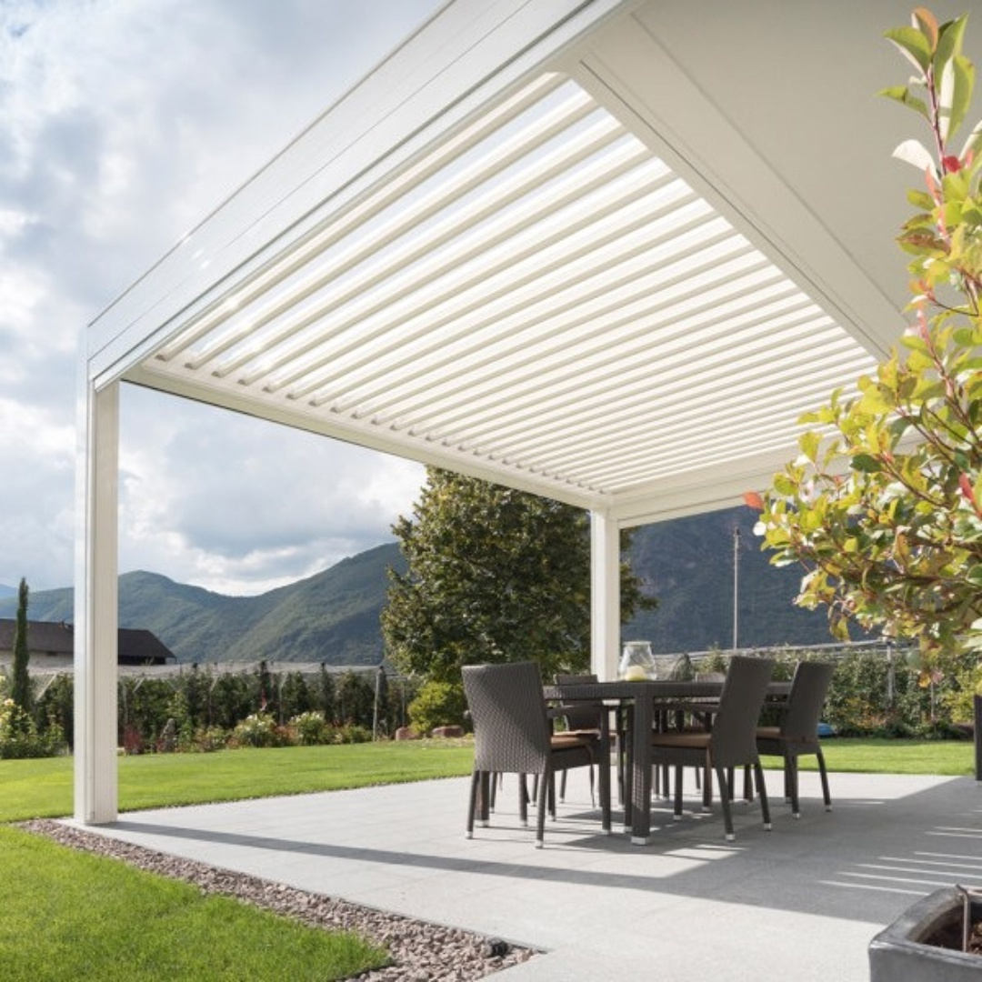 Пергола устойчива к атмосферным воздействиям и рассчитана на долгие годы службы благодаря продуманной конструкции, а также алюминию с порошковым покрытием. Большая часть фурнитуры изготовлена из нержавеющей стали, что обеспечивает надежные соединения высокого стандарта. Вода отводится с помощью специально разработанной водосточной системы, спрятанной в подставке.