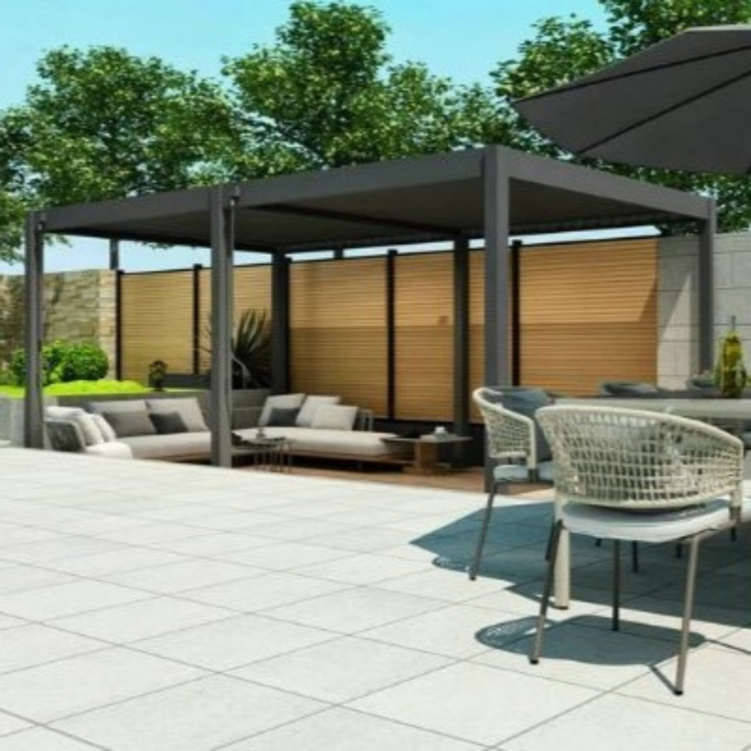Пергола устойчива к атмосферным воздействиям и рассчитана на долгие годы службы благодаря продуманной конструкции, а также алюминию с порошковым покрытием. Большая часть фурнитуры изготовлена из нержавеющей стали, что обеспечивает надежные соединения высокого стандарта. Вода отводится с помощью специально разработанной водосточной системы, спрятанной в подставке.