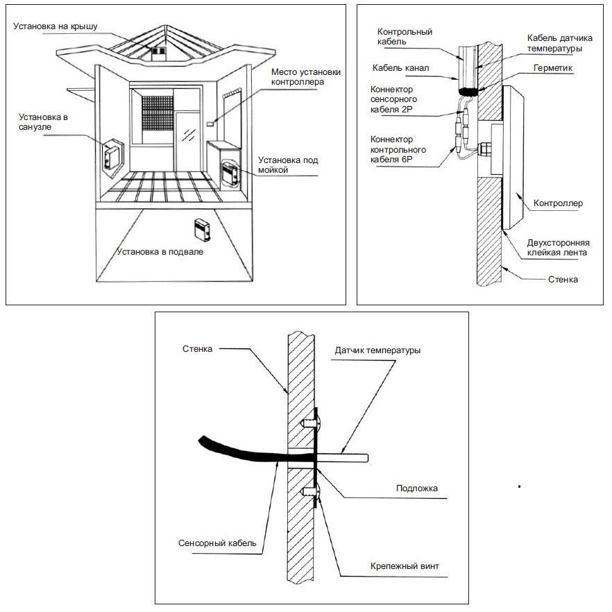 Установка проводится в сухом, вентилируемом месте на устойчивой горизонтальной поверхности. При установке парогенератора обеспечивают свободную зону вокруг корпуса минимум на 30 см. Датчик температуры выносится в кабинку. Незащищенные от влаги и пара пульты должны размещаться вне кабинки. Пульты серии KS-150, KS-320А могут ставиться в парной. Для подачи пара рекомендовано ставить только медную трубу. ПВХ, акриловые и мягкие трубы не разрешены из за высокой температуры пара.