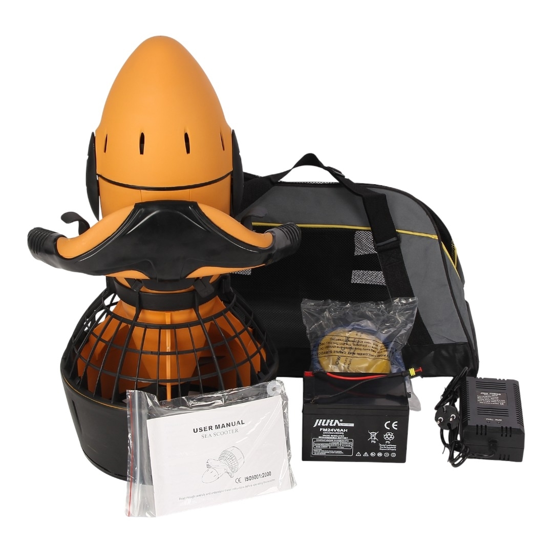Водный скутер Jcaqua JUP1-300 - используется для погружения под воду и исследования подводного мира. Имеет герметичный корпус из прочного пластика, функцию регулирования скорости, защиту от перегрева двигателя, низкое напряжение и защиту от перегрева печатной платы. Оснащен мощным двигателем и свинцово-кислотным аккумулятором, обеспечивающим продолжительность работы и высокую скорость.