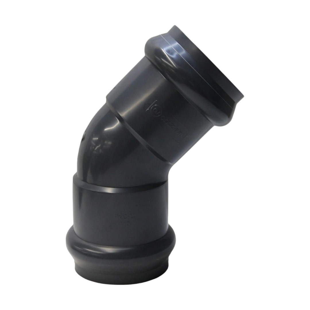 Отвод 45° двухраструбный Aquaviva - предназначен для плавного изменения направления движения трубы и потока рабочей среды в трубопроводе. Используется для труб и фитингов под уплотнительное кольцо. Изготовлен из высококачественного ПВХ, устойчивого к окислению и химии. Подходит для транспортировки жидкостей от 1 до +60°C под давлением и может использоваться в системах водоснабжения и водоподготовки.