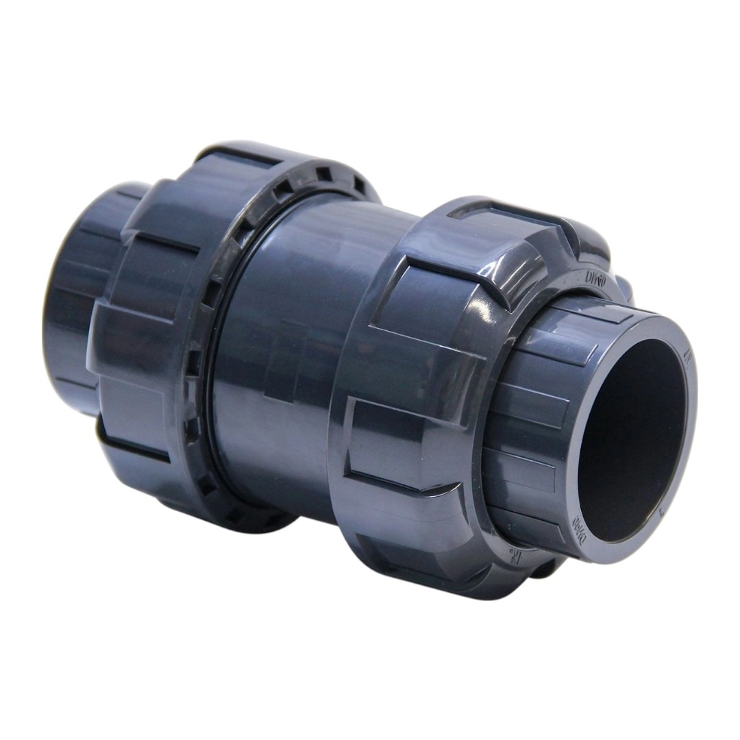 Обратный клапан пружинный Aquaviva - используется для недопущения изменения направления потока жидкости в трубопроводе. Пропускает жидкость в одном направлении и препятствует ее движению в противоположном. Изготовлен из непластифицированного поливинилхлорида PVC-U. Имеет уплотнение из EPDM. Подходит для транспортировки жидкостей от 1 до +60°C под давлением и может использоваться в системах водоснабжения и водоподготовки.