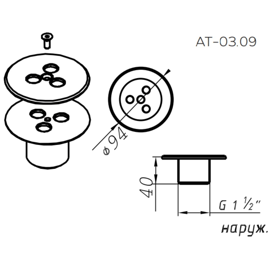Форсунка донная Акватехника АТ 03.09M c комбинированной подачей - часто называется донной форсункой возврата воды. Устанавливается в донной части бассейна и создает рассеянный поток воды в прямом направлении. Может быть также использована как переливной фитинг, трап и т.д.