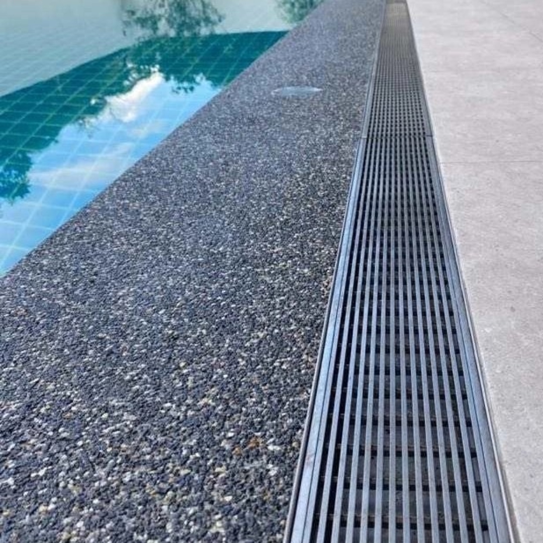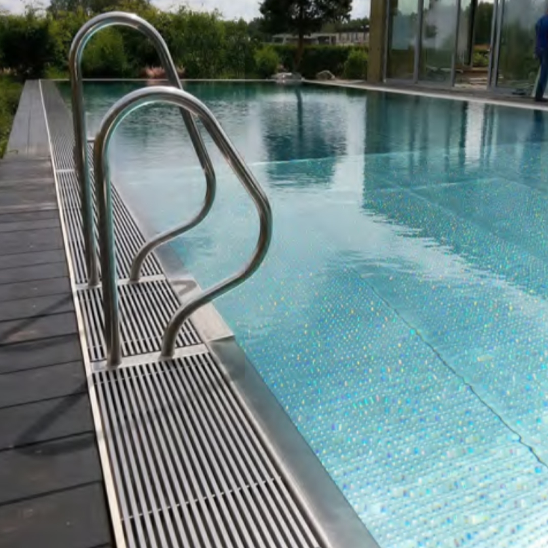 Исполнение переливной решетки может быть сделано как на прямой, так и на овальный или радиусный участок. Размер направляющих также возможно изменить на любой из существующих по желанию заказчика.