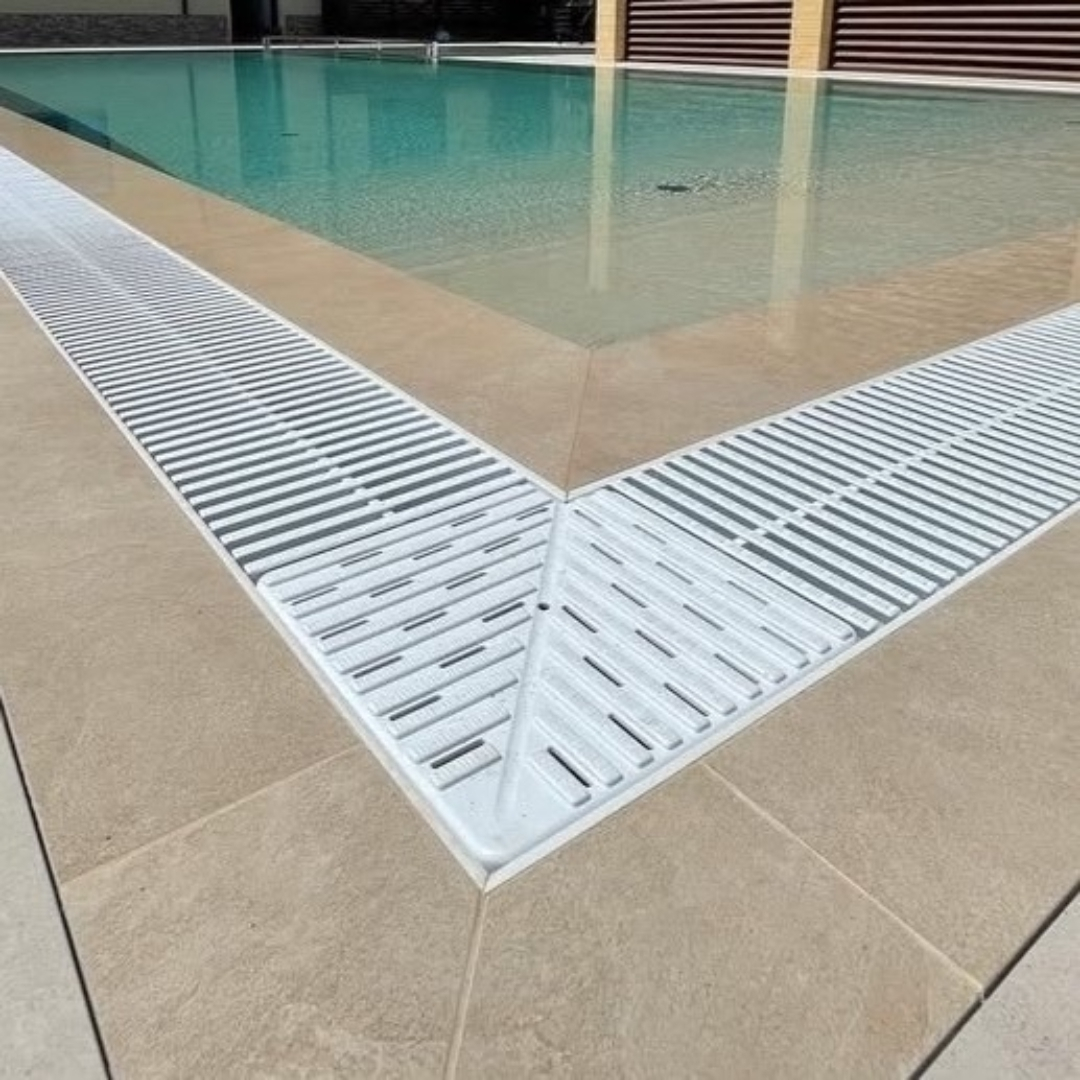Угловой элемент AstralPool 90° - используется для создания углового соединения в переливных бассейнах. Изготовлен из прочного литого полипропилена, стойкого к ультрафиолету и влажности. Имеет нескользкую поверхность. Отверстия, расположенные вдоль переливных каналов, предотвращают накапливание воды.