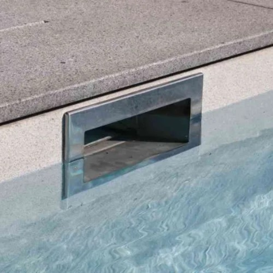 Винты прижимного фланца находятся внутри корпуса тем самым обеспечивая полную гидроизоляцию. Крышка полностью закрывает внутренний отсек скиммера, чем обеспечивает полную изоляцию места соприкосновения плитки и корпуса скиммера.