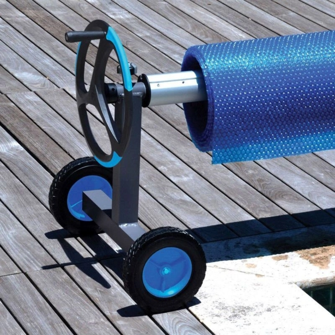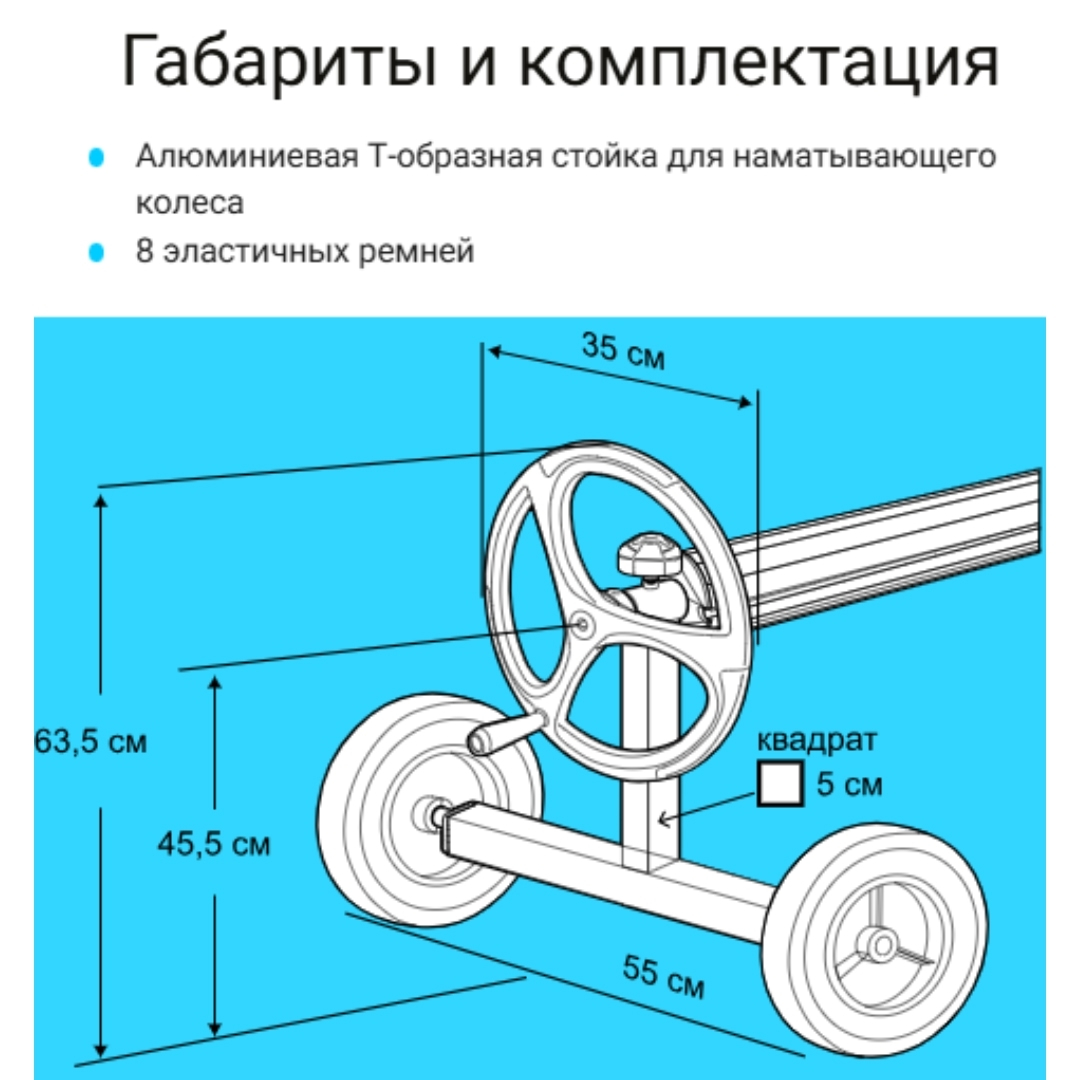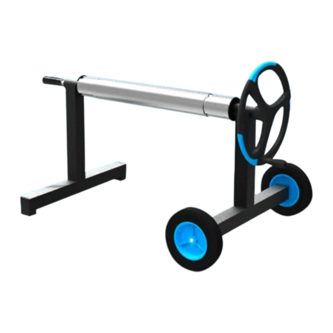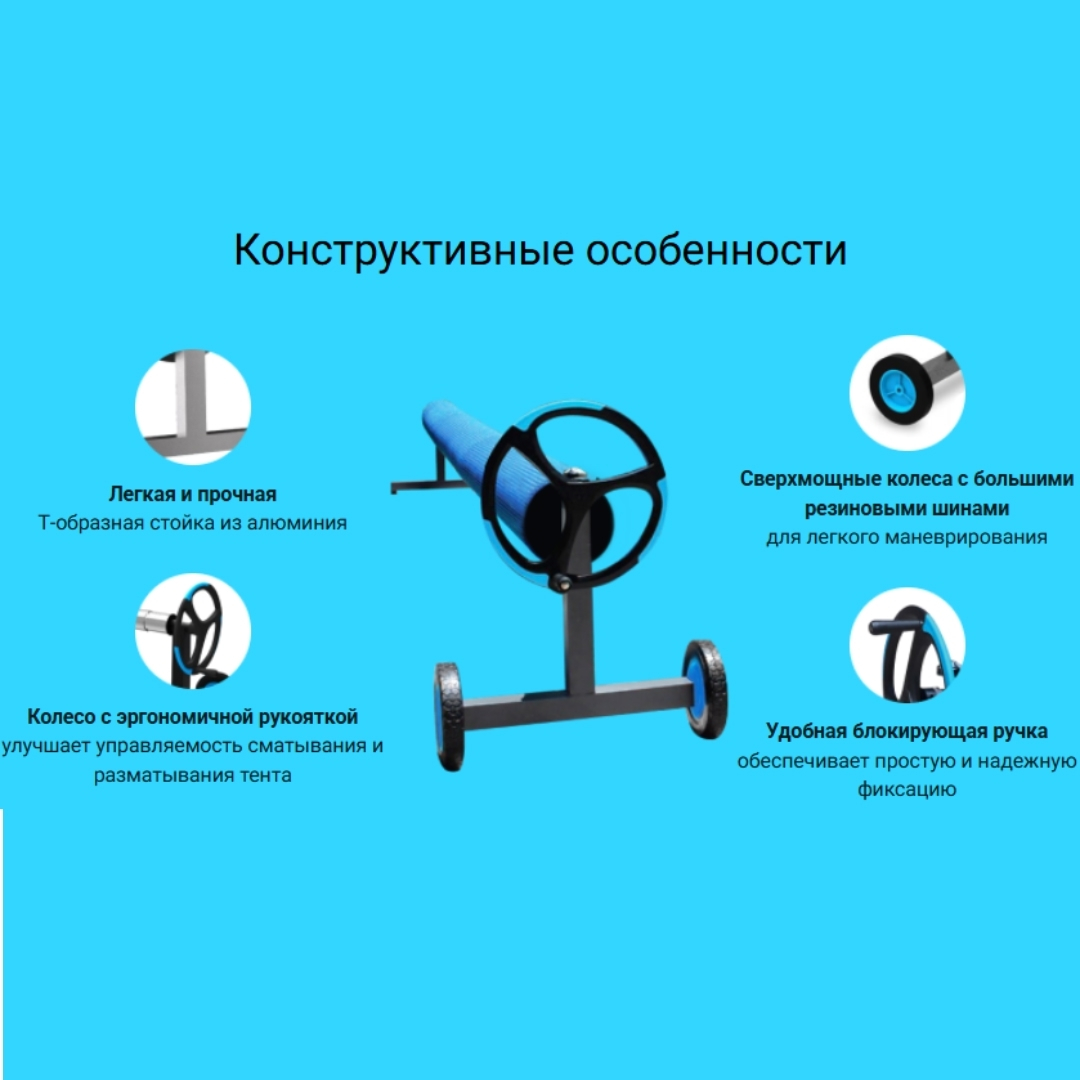 Конструкция изготовлена из литого алюминиевого сплава, устойчивого к коррозии и воздействию ультрафиолета. Т-образная стойка с прочными колесами на протекторах обеспечивает хорошую маневренность. Устройство имеет удобное ручное колесо с хватом и систему фиксации теплосберегающей пленки. Оснащено набором специальных ремней для установки солярного покрытия.