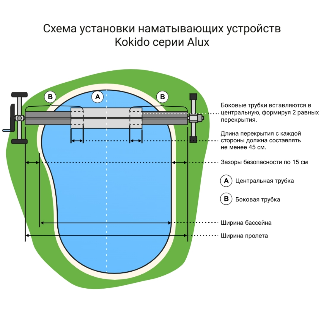 Наматывающее устройство Kokido Alux - позволяет легко и быстро сматывать и разматывать покрытие для бассейна. Благодаря своей надежности, механизм выдерживает нагрузку в 30кг, учитывая вес трубок, усилителя и мокрого тента, при этом гарантируя плавность и равномерность движения покрытия. Управление с помощью ручного колеса с удобным захватом.