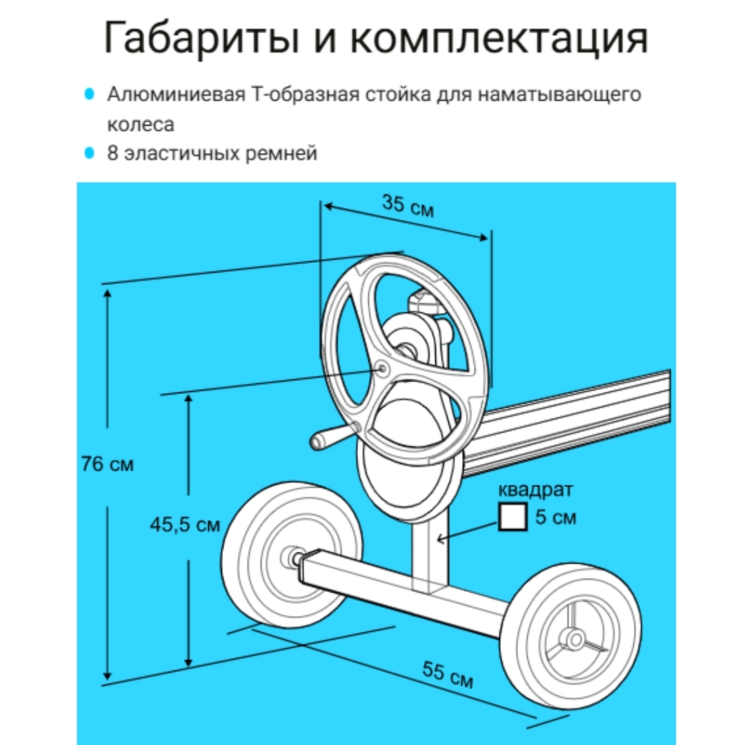 Конструкция изготовлена из литого алюминиевого сплава, устойчивого к коррозии и воздействию ультрафиолета. Усилитель Presto с цепным приводом снижает вращательное усилие на 50%. Т -образная стойка с колесами на протекторах обеспечивает хорошую маневренность. Устройство имеет удобное ручное колесо с хватом и систему фиксации теплосберегающей пленки. Оснащено набором специальных ремней для установки солярного покрытия.