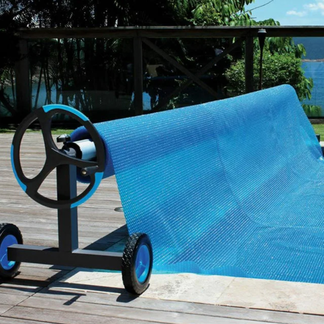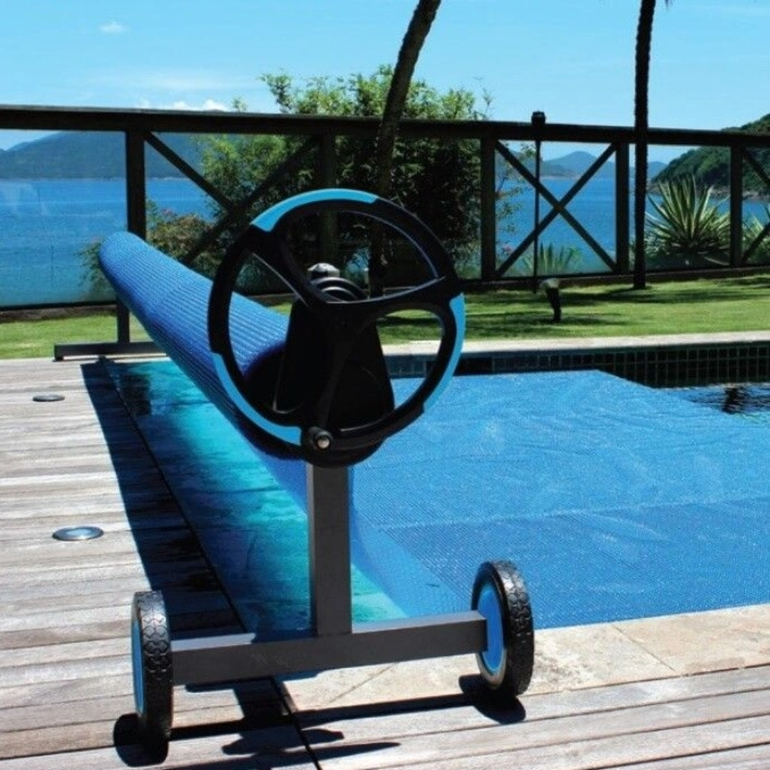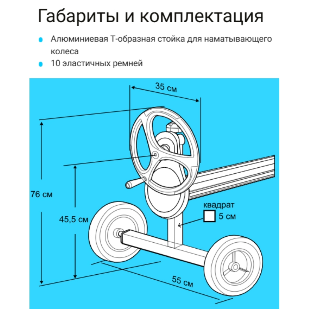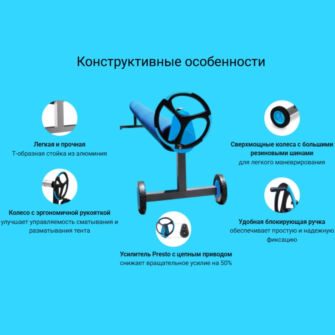 Конструкция изготовлена из литого алюминиевого сплава, устойчивого к коррозии и воздействию ультрафиолета. Усилитель Presto с цепным приводом снижает вращательное усилие на 50%. Т -образная стойка с колесами на протекторах обеспечивает хорошую маневренность. Устройство имеет удобное ручное колесо с хватом и систему фиксации теплосберегающей пленки. Оснащено набором специальных ремней для установки солярного покрытия.