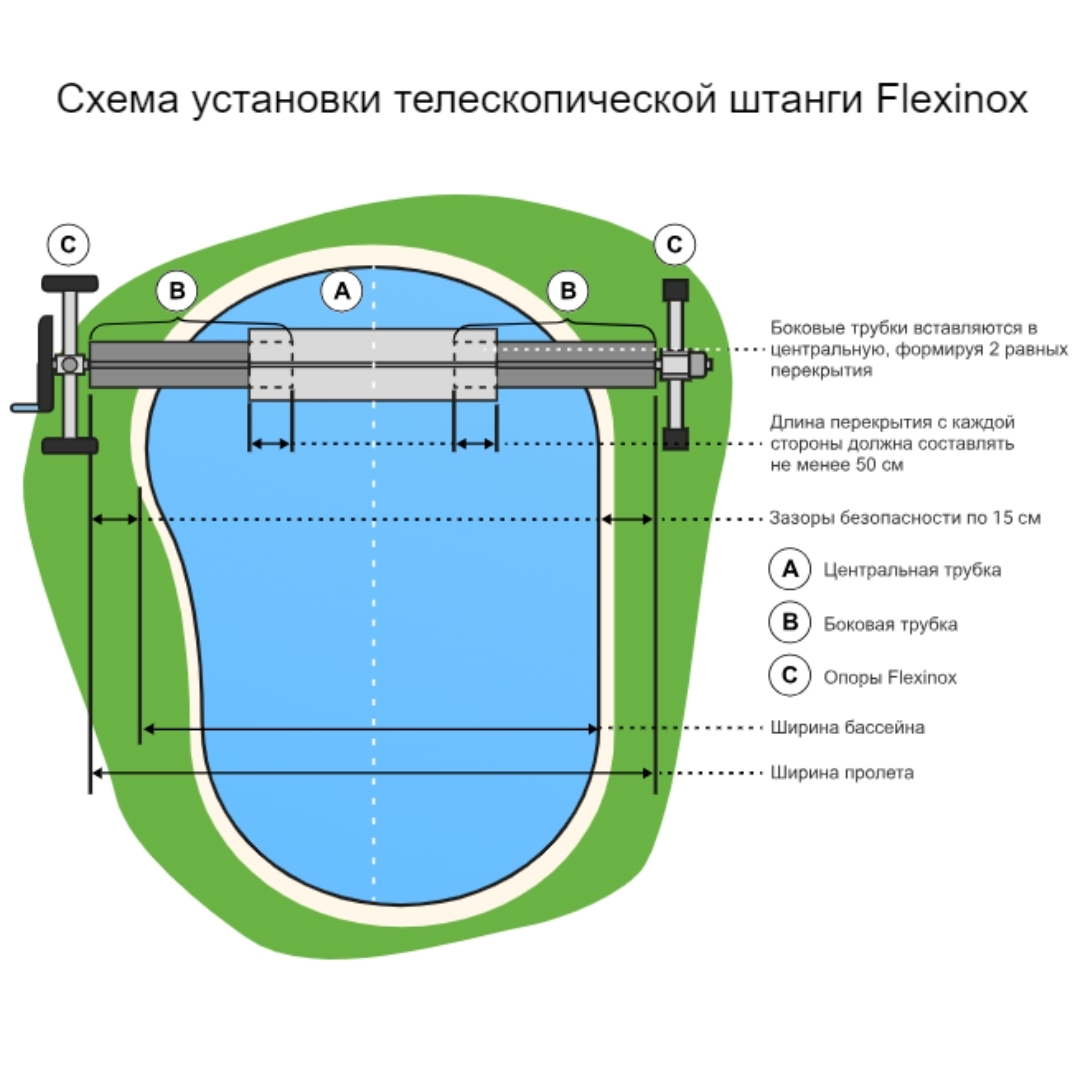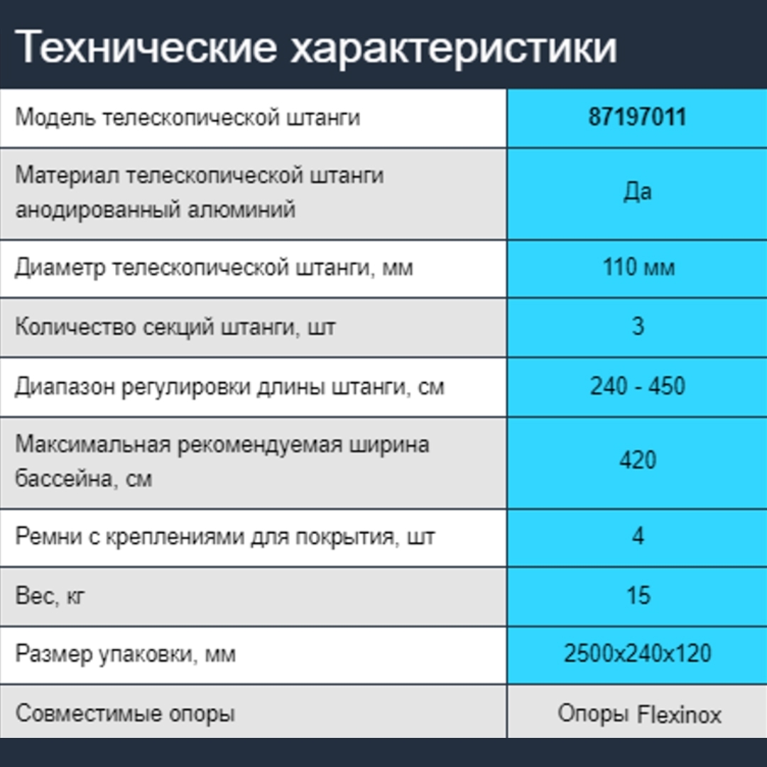 Телескопическая штанга Flexinox 87197011 - используется для фиксации и наматывания солярного или защитного покрытия бассейна. Изготовлена из анодированного алюминия, устойчивого к коррозии, воздействию ультрафиолета и химии. Имеет трехсекционную конструкцию, с помощью которой можно настраивать длину штанги. Длина штанги регулируется в диапазоне от 240 см до 450 см. Комплектуется фиксирующими ремнями.
