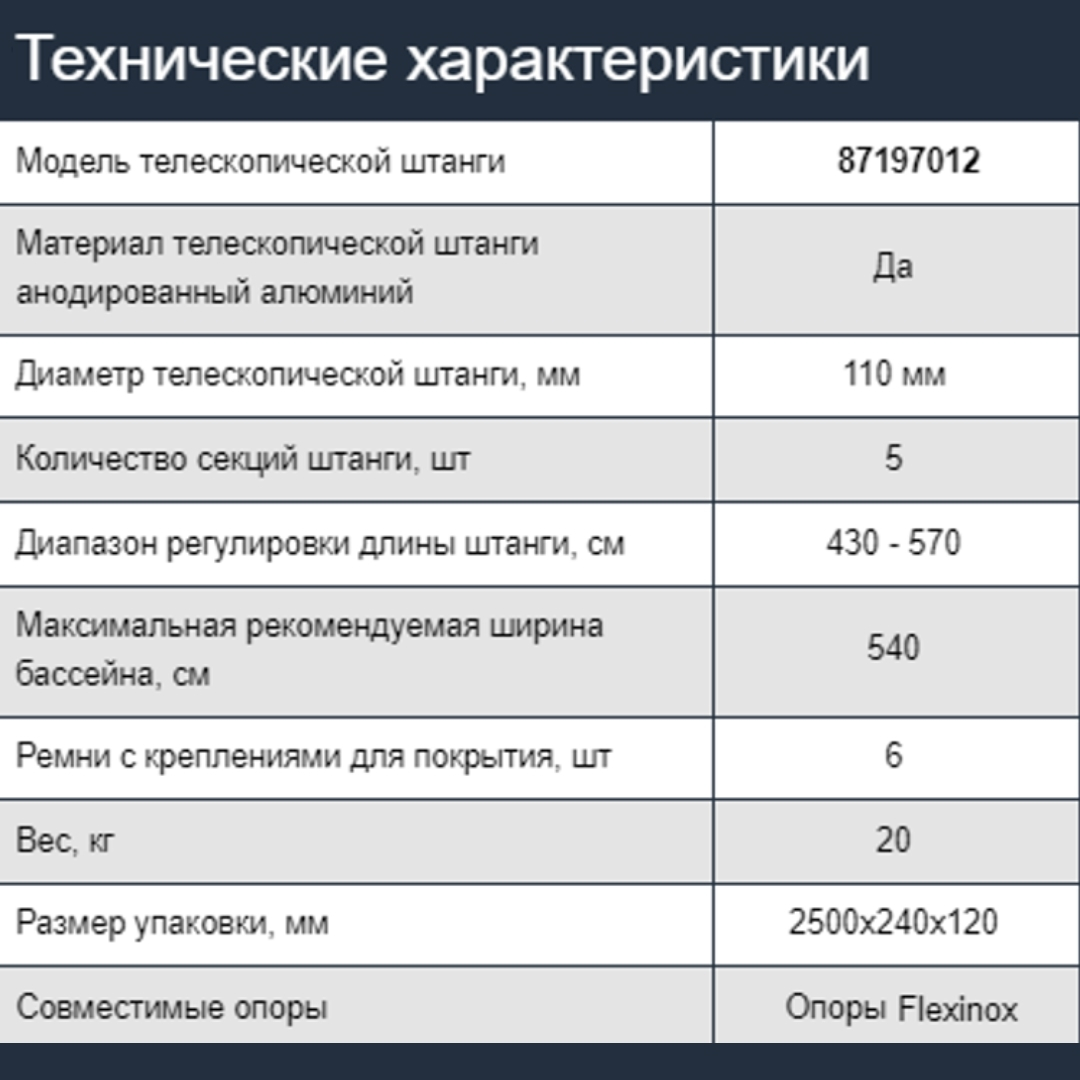 Телескопическая штанга Flexinox 87197012 - используется для фиксации и наматывания солярного или защитного покрытия бассейна. Изготовлена из анодированного алюминия, устойчивого к коррозии, воздействию ультрафиолета и химии. Имеет пятисекционную конструкцию, с помощью которой можно настраивать длину штанги. Длина штанги регулируется в диапазоне от 430 см до 570 см. Комплектуется фиксирующими ремнями.