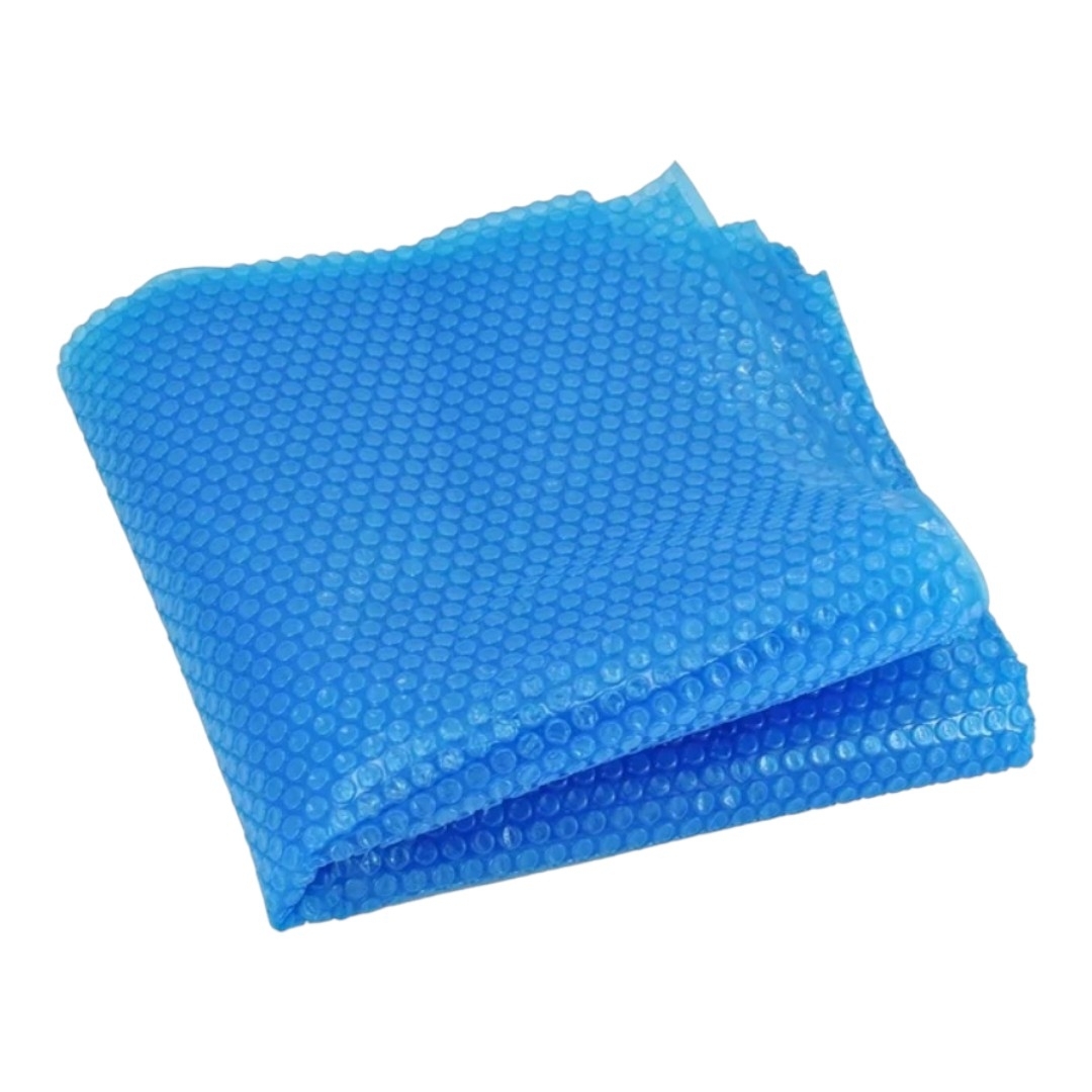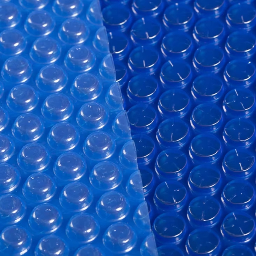 Покрывало изготовлено из прочного полиэтилена низкой плотности. Материал устойчив к ультрафиолетовым лучам и влажности. Имеет синий цвет и воздушные пузырьки, за счет которых покрытие удерживается на поверхности бассейна.